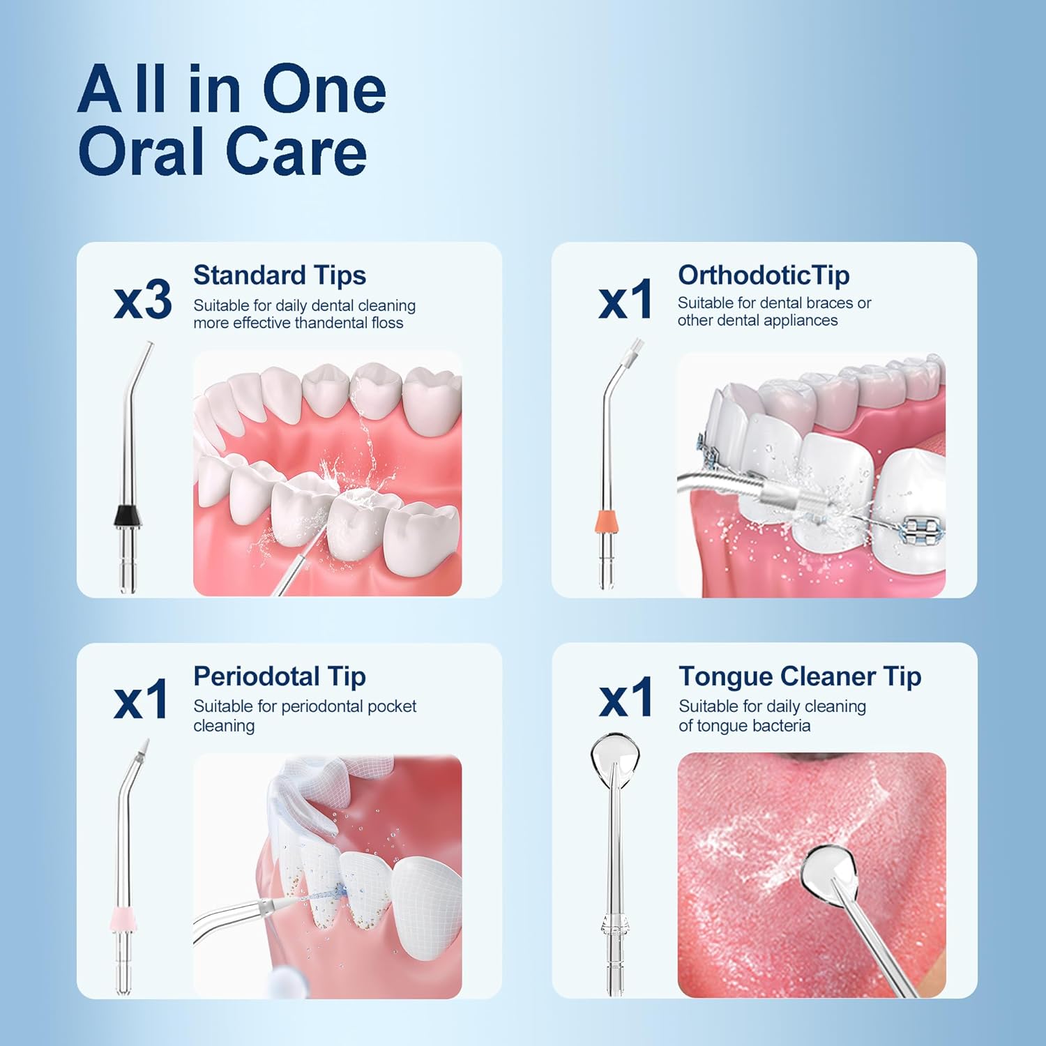 - 【Powerful Water Teeth clean&Improving your gums】Say NO to bad breath! Equipped with a strong pump the water pick tooth cleaner has a pulse frequency of 2200-3000 beats per minute, bringing high-powered water delivery. 50-150 PSI water pressure remove food residues and stains between teeth and below the gum line thoroughly, keeps your oral fresh and whiten your teeth.
