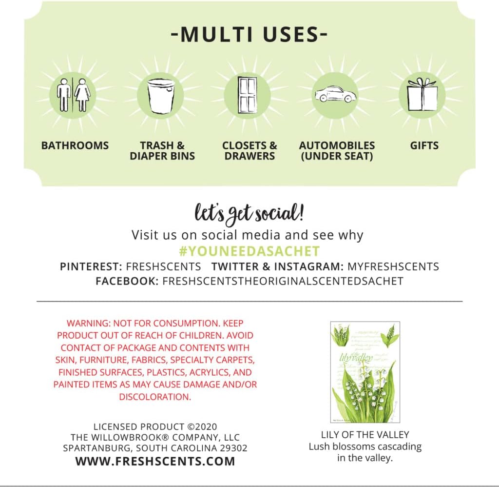 WILLOWBROOK | Fresh Scents Scented Sachet Packet | Lily of The Valley | Air Freshener Bags for Drawers, Closets, Cars | 6 Pack | Long Lasting Home Fragrance