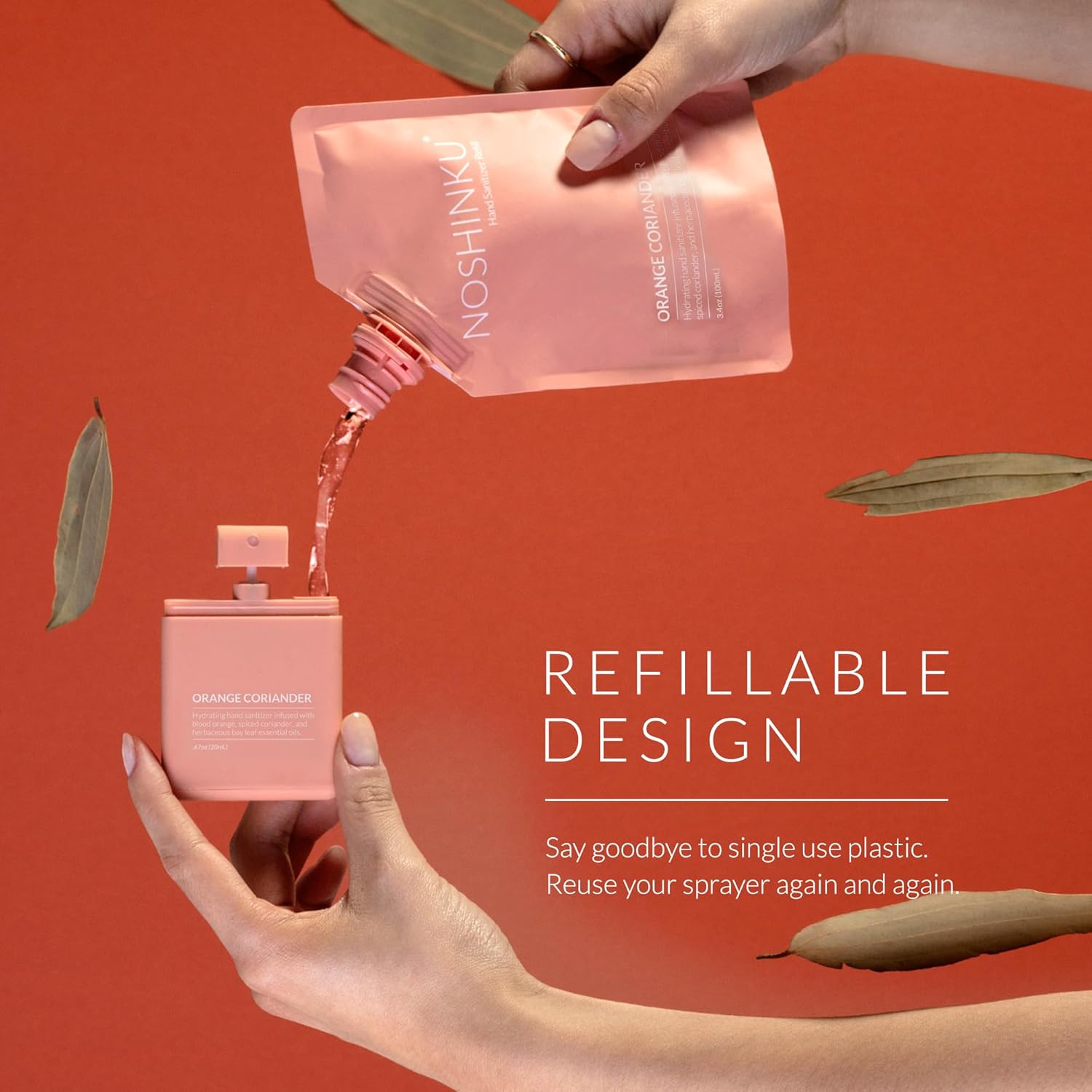 Noshinku - Refillable Hand Sanitizer Orange Coriander 3-Pack, Travel Size Spray, Hydrating Botanical Oils, Natural Ingredients, All Natural Fragrances, Sugarcane Derived Alcohol, No Parabens, No Dyes