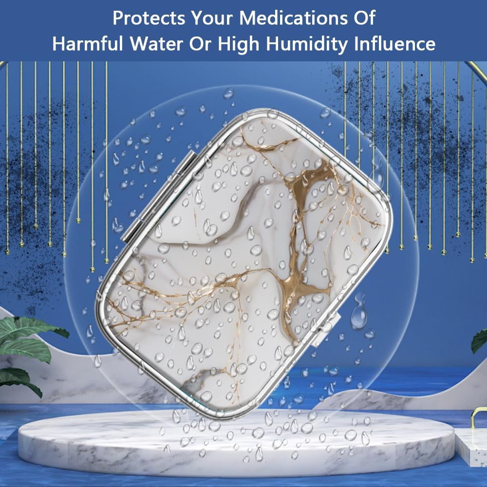 Pill Box 2 Compartment Small Pill Case,Portable for Pocket or Purse Pill Organizer Pill Container Holder to Hold Vitamins, Medication, Fish Oil and Supplements(Gray Marbling Gold)