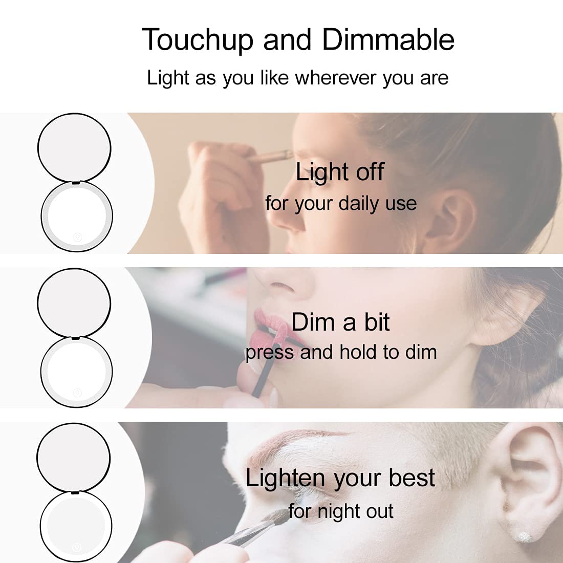 • 【Easy to Use & Compact Size】: Double click to turn on the light; hold and press to adjust the brightness as you need; click once to turn off when you don’t need light. Our LED travel makeup mirror is made of high-quality ABS plastics. The size of the compact mirror: 3.5*0.59in; Weight: 3.25oz can be stored in a handbag, purse or pocket.