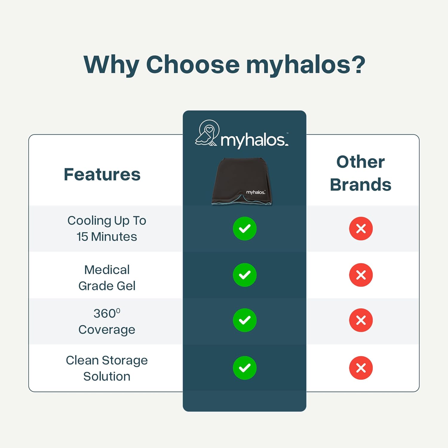 - { The Power of Cold Therapy } When your head is pounding, you need a cooling ice hat that lasts longer than regular liquid ice packs and doesn't leave your head wet! The MyHalos sinus pressure relief mask can be worn as a migraine ice head wrap or ice pack head wrap.