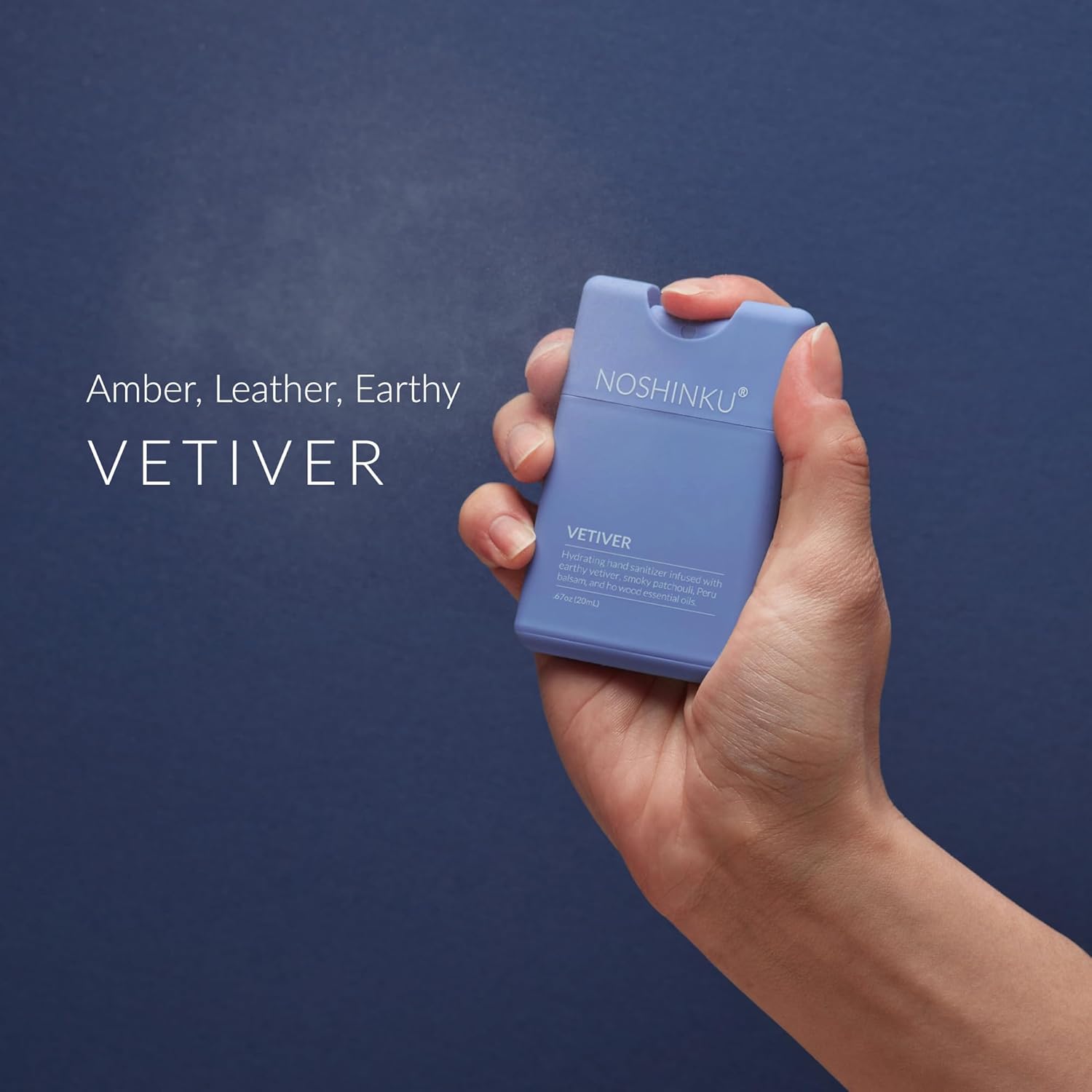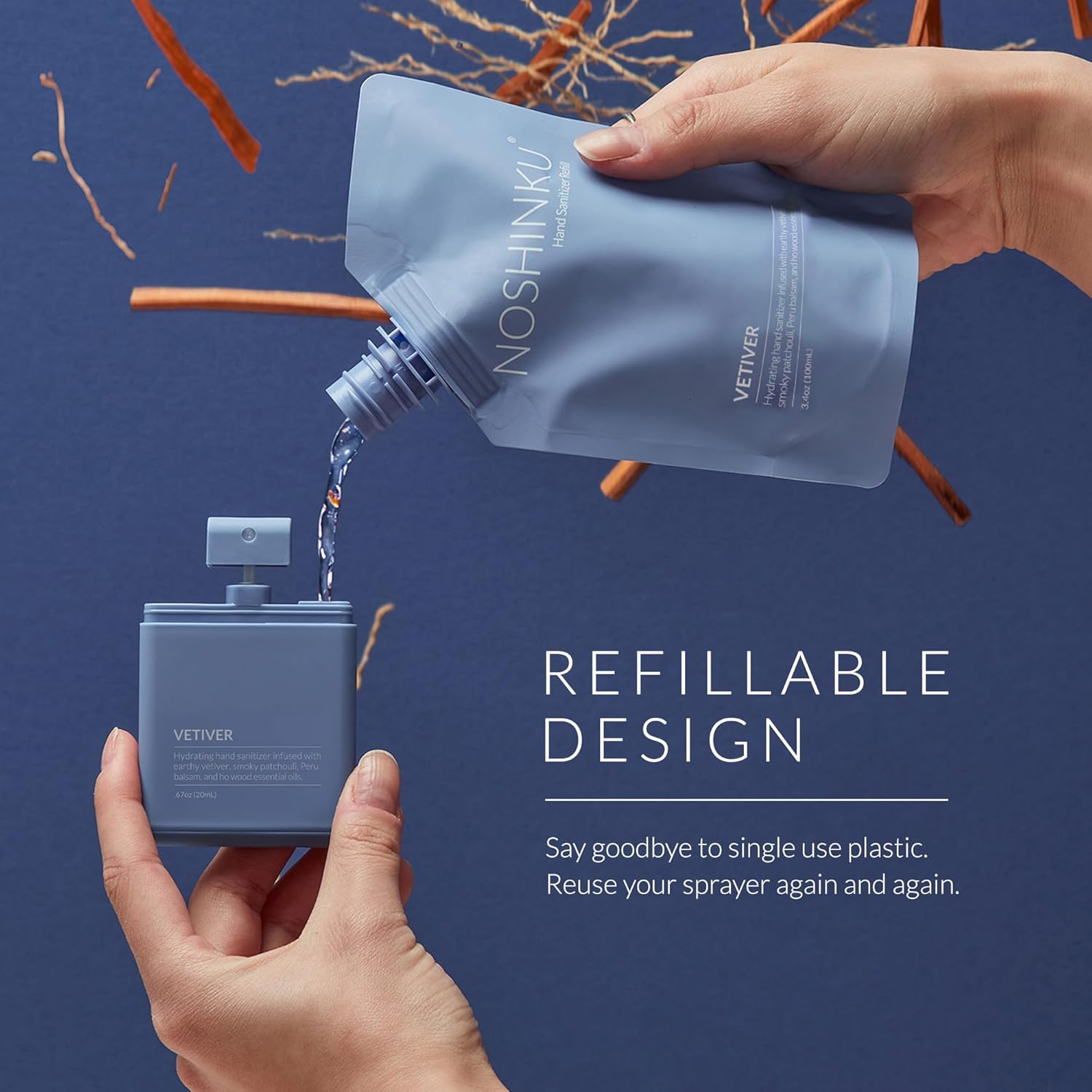 Noshinku - Refillable Hand Sanitizer Vetiver 3-Pack, Travel Size Spray with Hydrating Botanical Oils, Natural Ingredients, All Natural Fragrances, Sugarcane Derived Alcohol, No Parabens, No Dyes