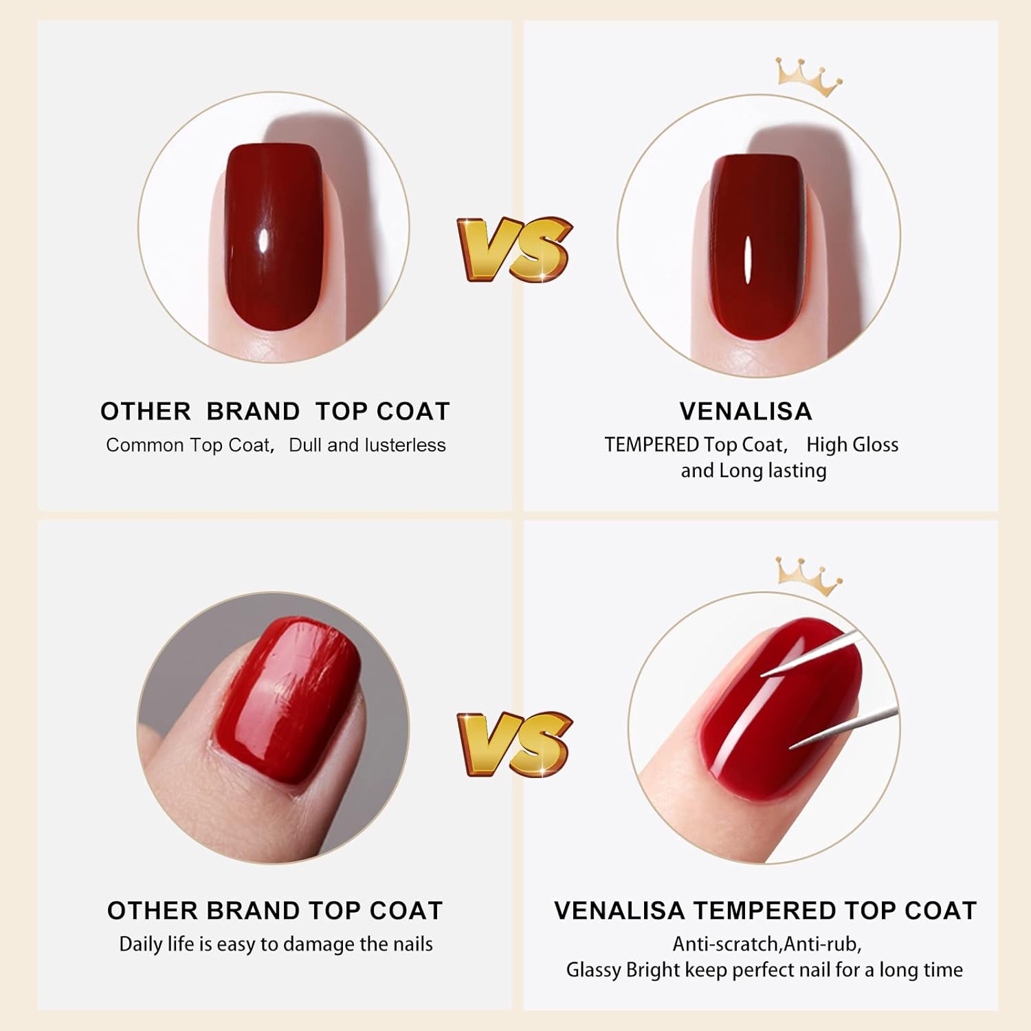 - VENALISA No Wipe Tempered Top Coat and Base Coat: Long lasting for 28+ days. No nicks, chips or smudges.