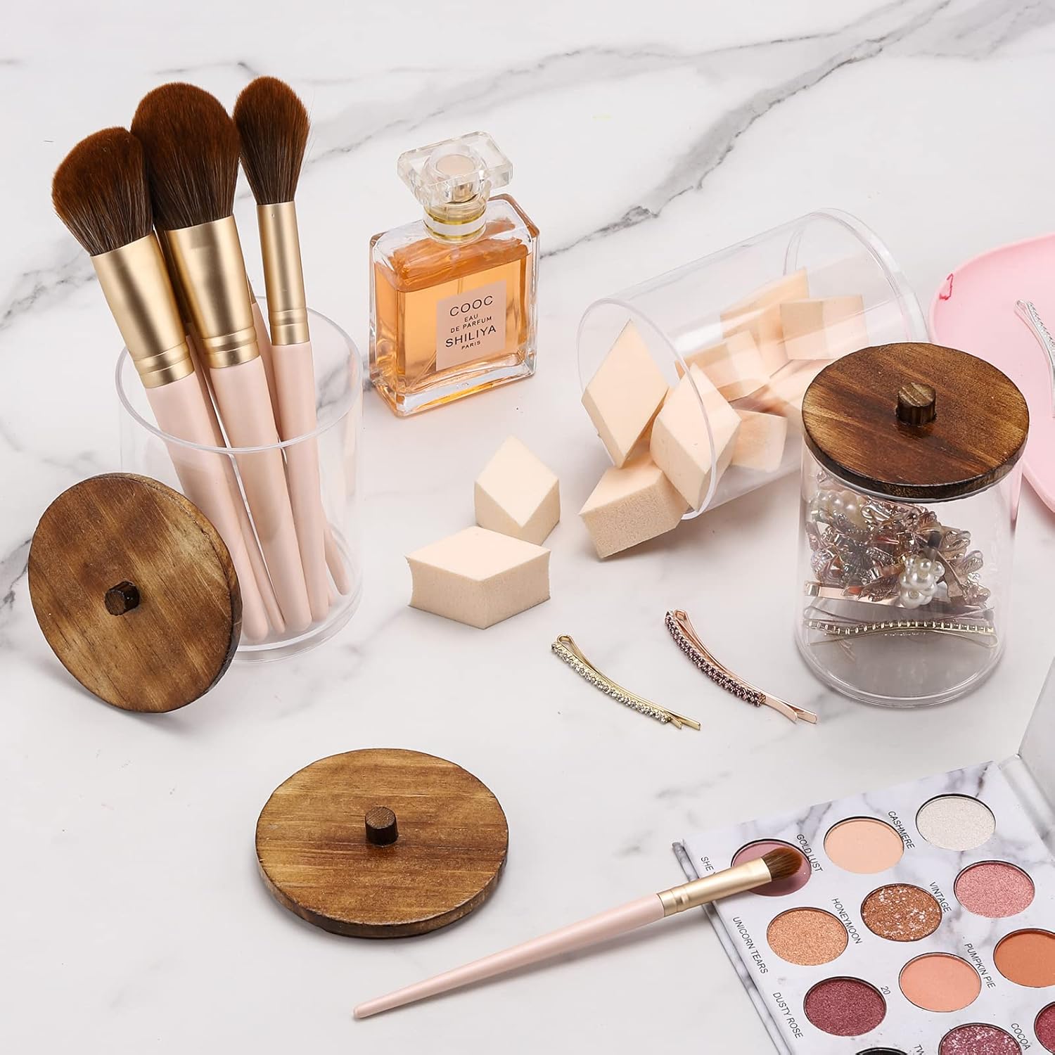 Tbestmax 4 Pack Qtip Holder Dispenser Cotton Ball, Cotton Swab, Floss - 12oz, 10 oz Clear Plastic Apothecary Jars for Bathroom Organizer and Storage Containers (Brown Wood Lids)
