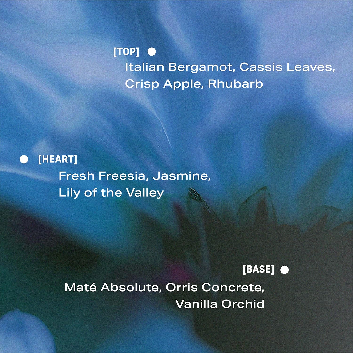 - SCENT NOTES: Top - Italian Bergamot, Cassis Leaves, Crisp Apple, Rhubarb. Heart - Fresh Freesia, Jasmine, Lily of the Valley. Base - Maté Absolute, Orris Concrete, Vanilla Orchid.