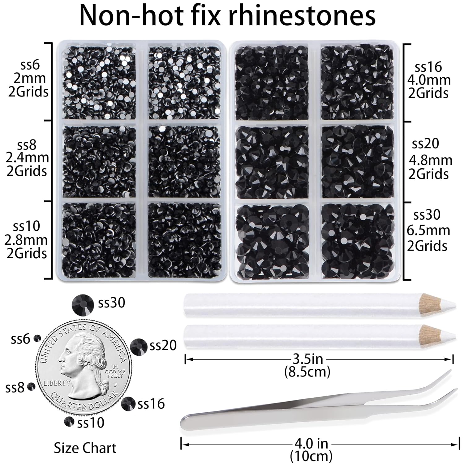 - Approx 6000 pcs of good quality sparkly flatback glass rhinestones with tweezers and 2 picker wax pencils help you easily pick up and set rhinestones in all your jewelry.