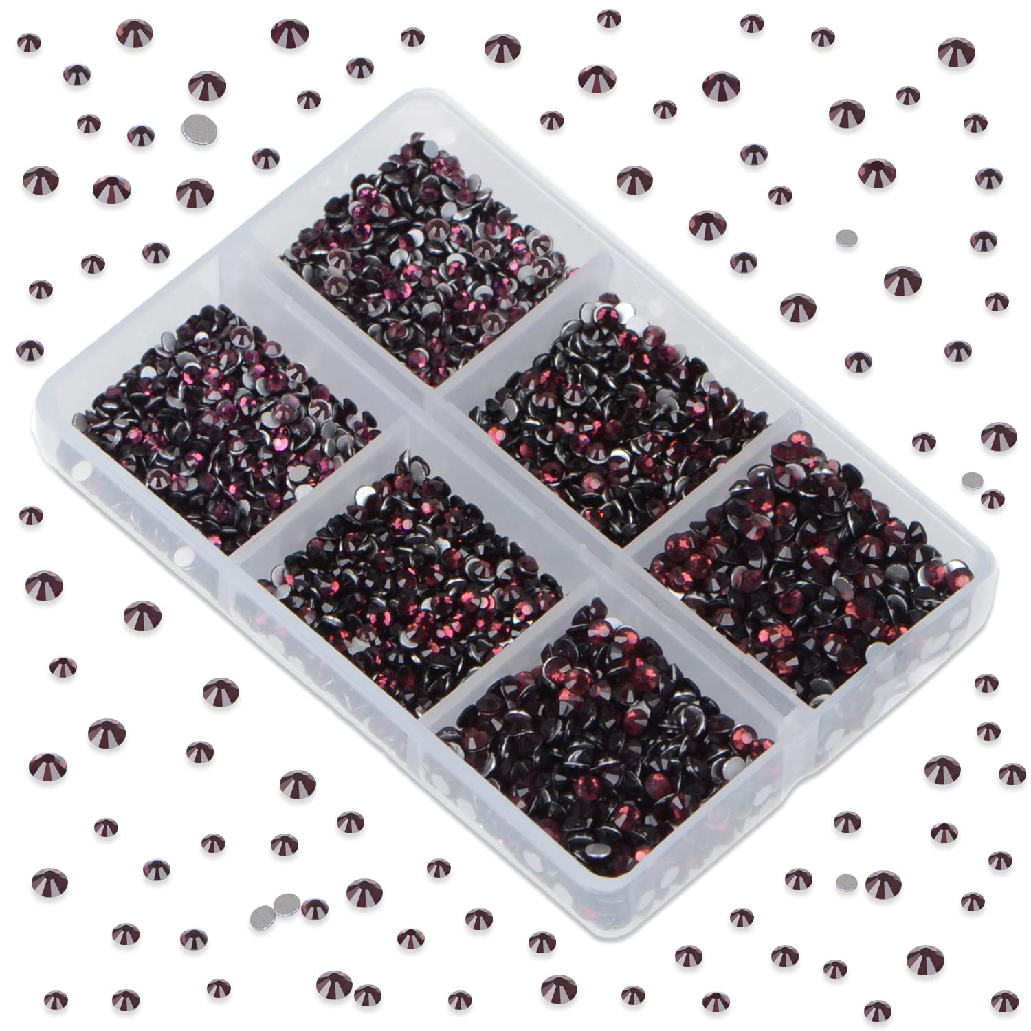 - 6 Sizes charming crystal rhinestones with storage boxes easy to carry, 1.5mm to 6mm. ss6 ss8 ss10 ss16 ss20 and ss30. Rhinestones are not hotfix and require glue to stick them, glue is not included.
