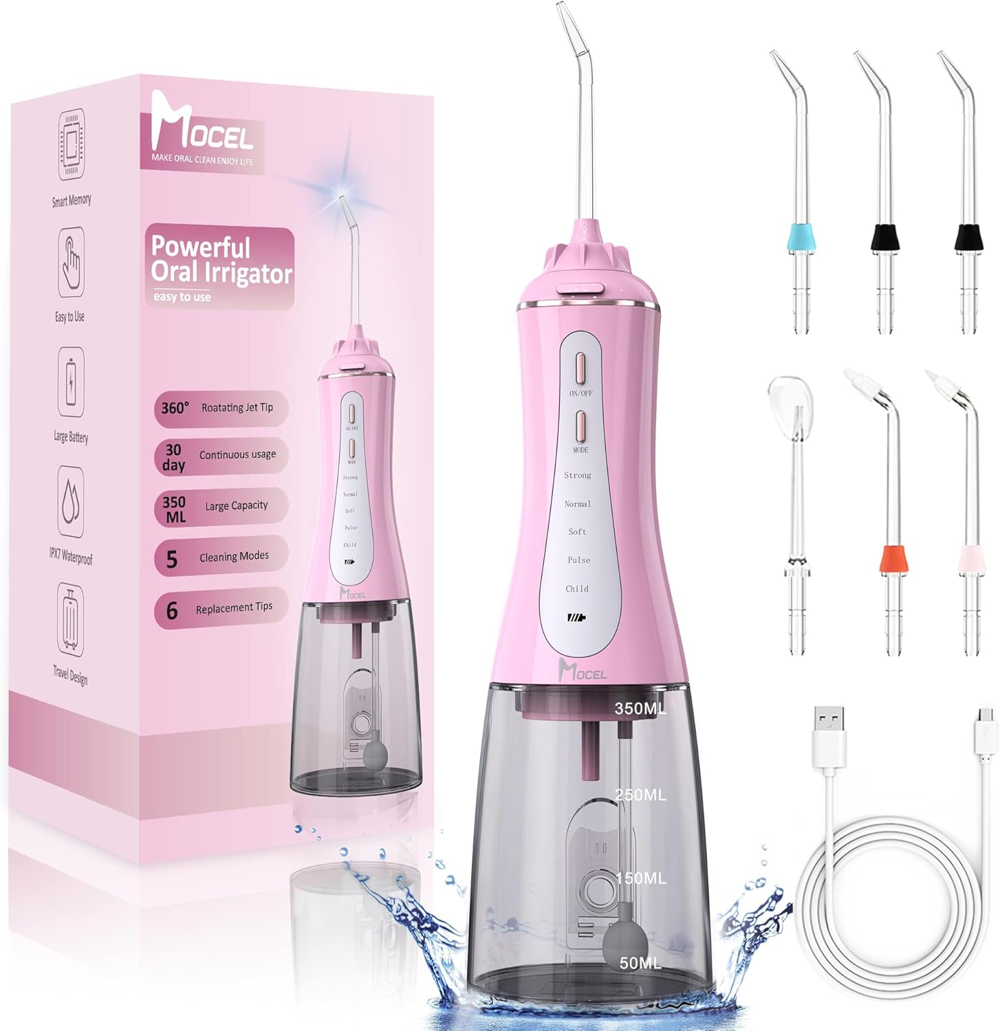 - 【350ML Big capacity & IPX7 Waterproof】Yes, With 350ml water tank! don't need to refill water multiple times. The capacity of our water dental floss is far better than other products. The removable water tank is easy to clean. Water dental flossers picks owns internal water leak-proof design, Mocel oral irrigator prevent water leakage reliably, It can use for shower in the bathroom and it's washable to clean