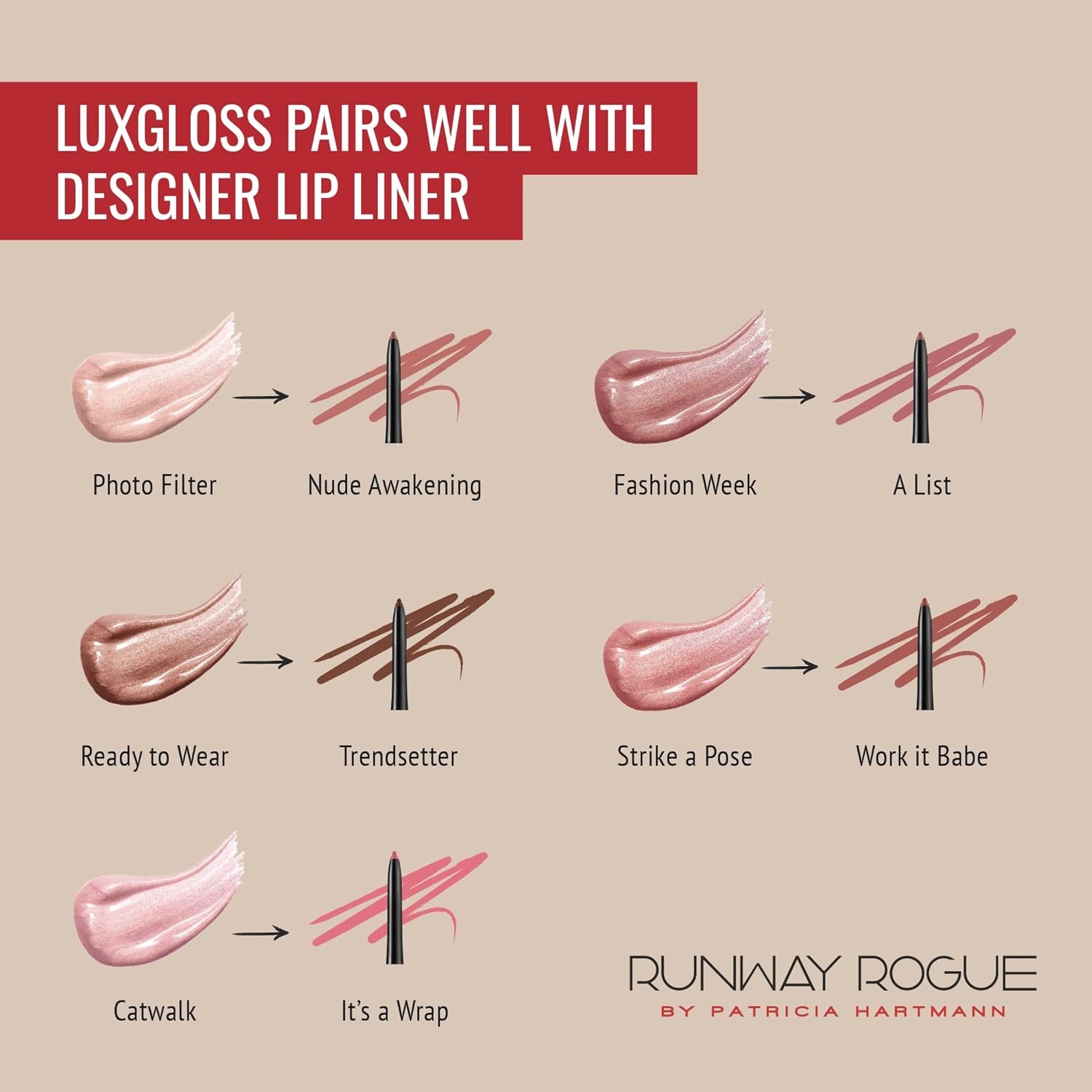 - RUNWAY WORTHY, MADE FOR REAL LIFE: Founded by ’90s supermodel and cover girl Patricia Hartmann, who was mentored backstage by makeup legends, Runway Rogue creates luxurious, easy-to-use lip products for on-the-go women who desire the runway look without the runway hassle. Elevate your every day with Runway Rogue, where glamour meets convenience, and make every moment your real-life catwalk.