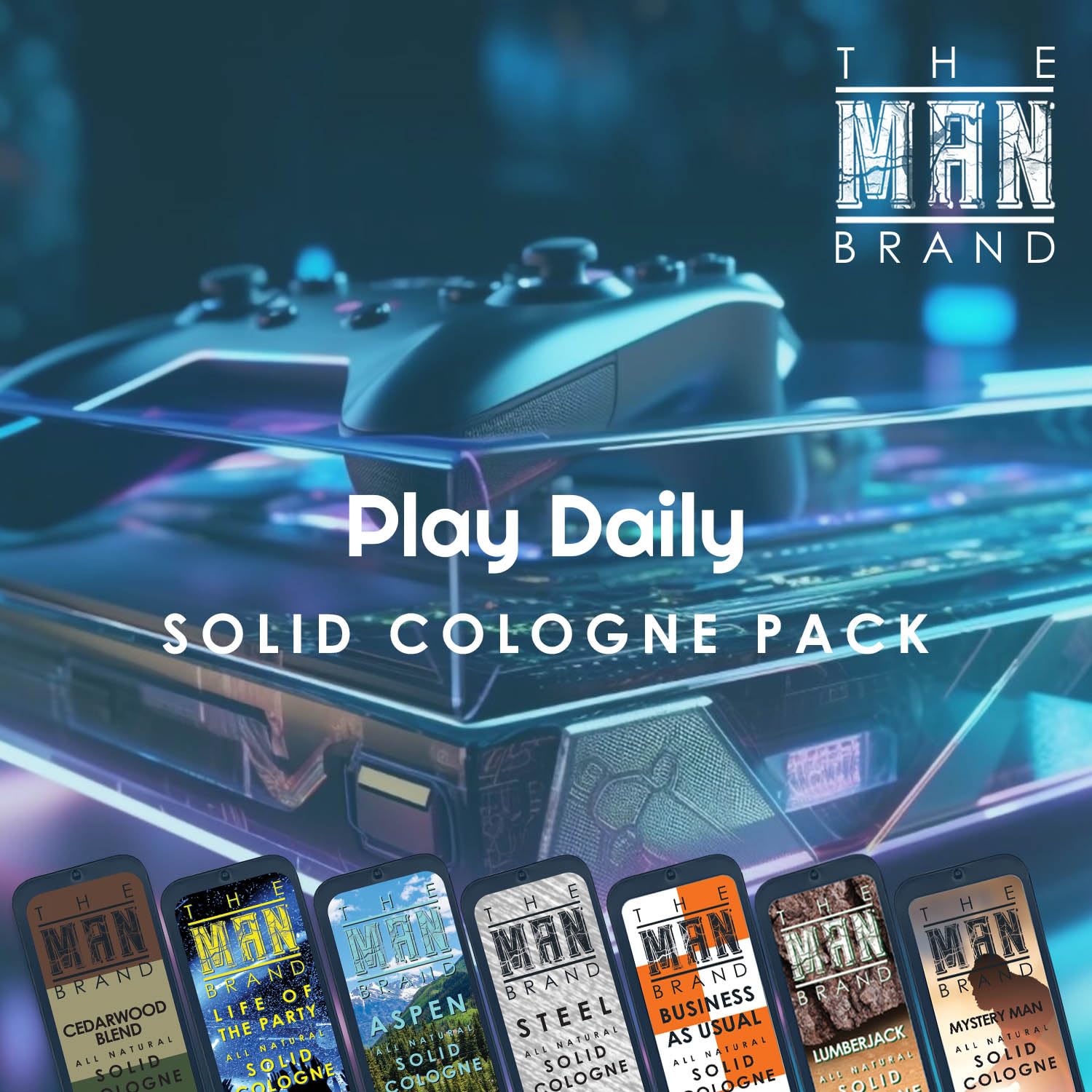 Mens Sample Solid Cologne Pack with Aspen, Lumberjack, Cedarwood Blend, Mystery Man, Life of the Party, Steel, and Business as Usual (Play Daily Solid Cologne Sampler Set - 7 Pack - 0.75 oz each)