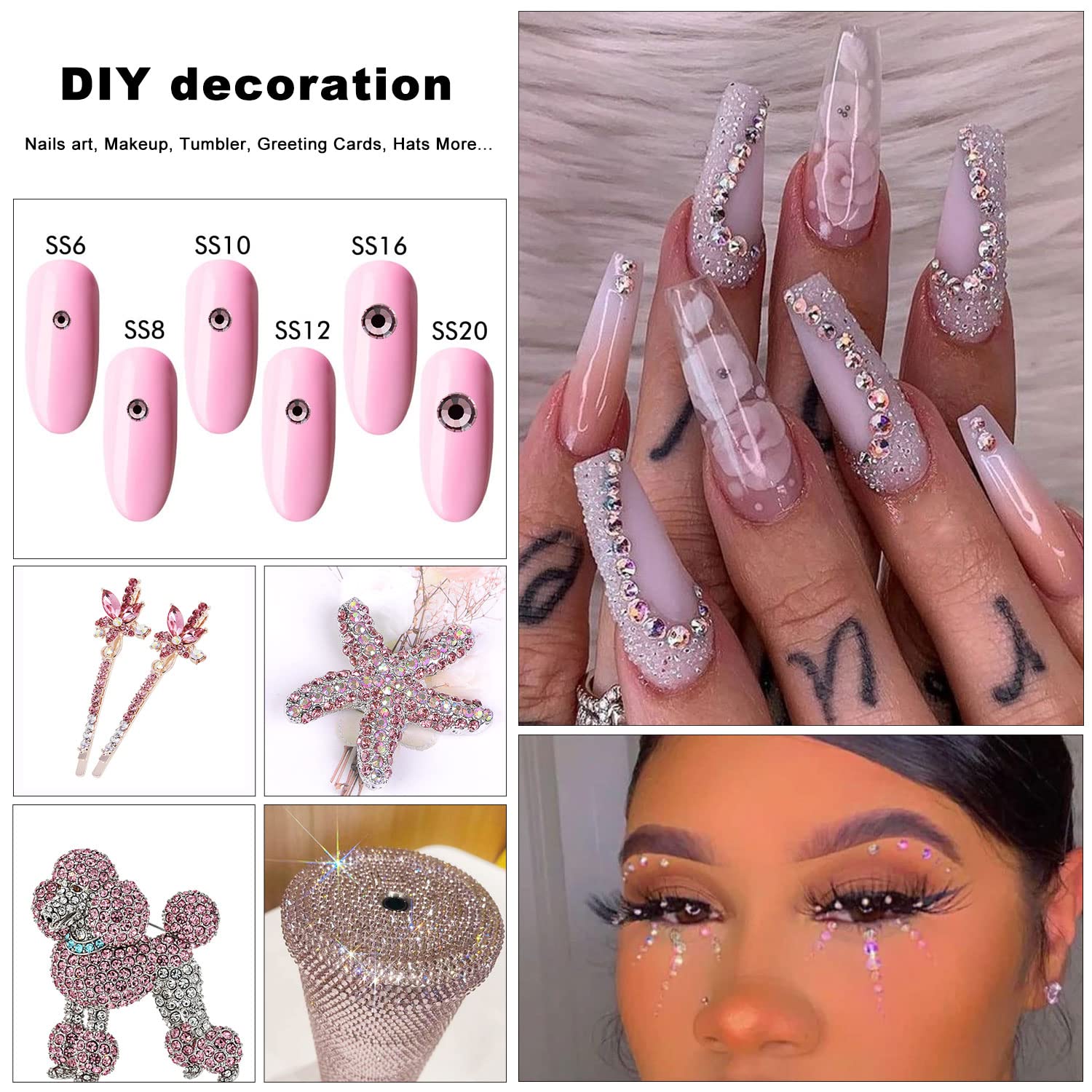 - 💎You can use rhinestones for, Nails, Art, Jewels, Skin, teeth, face, eye, Makeup, tumbler, glass, crafts, cardstock, phone, phone case, plastic, glasses etc. If you are using shoes, clothing, fabric textile type, I suggest you search on Amazon: B09ZQKTW4V