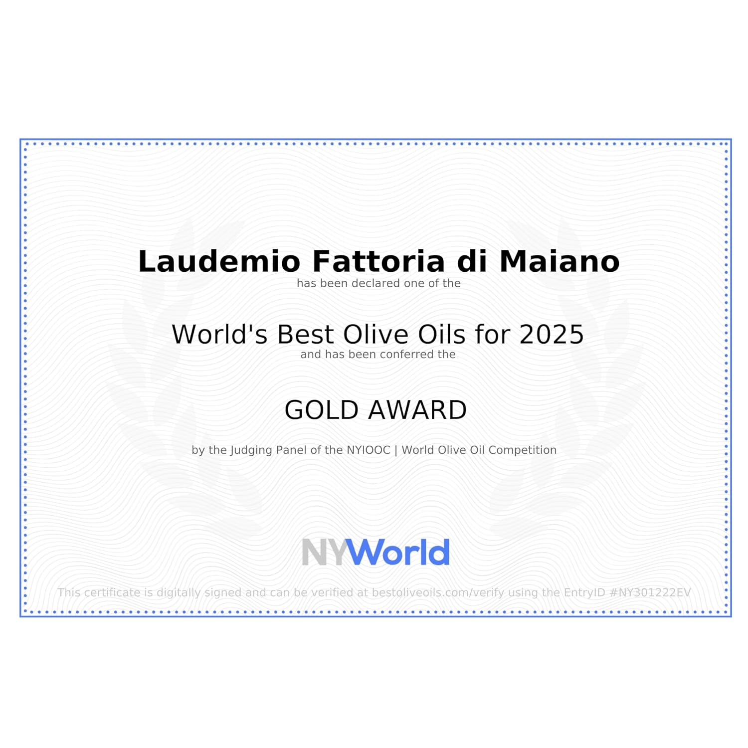 Sanniti Laudemio Organic Extra Virgin Olive Oil Fattoria di Maiano, Gold Award Winner at NYIOOC World Olive Oil Competition, 16.9 oz