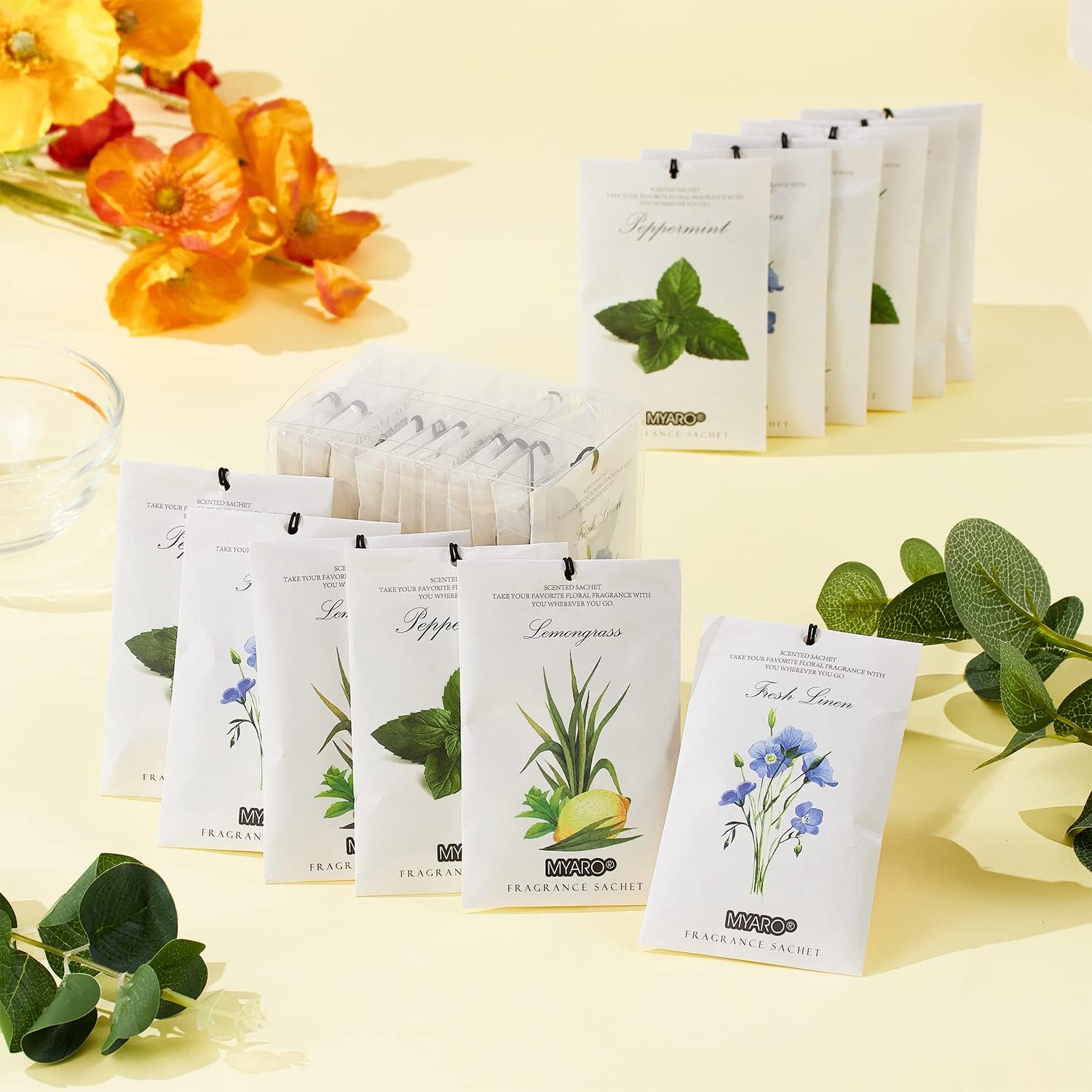 - MYARO 12 Sachets 6 Scent: MYARO Home Fragrance Sachet 3 Scents Option- Fresh Linen, Peppermint and Lemongrass, Four bags for each odor(Each Sachet Size: 4.13-inch x 2.76-inch). MYARO sachets bag is made of vermiculite and French essential oil which passed MSDS certification.
