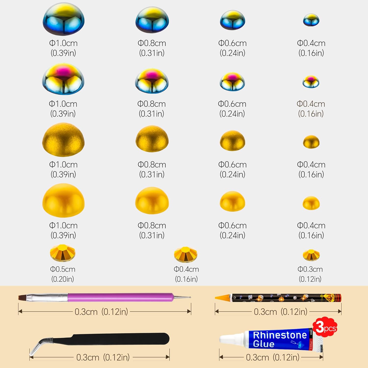 - Assortment Sizes: The flatback half pearls come in a mixture of colors and sizes of 3/4/5/6/8/10mm. The flatback rhinestones are resin rhinestones in sizes of 2/3/4/5/6mm. These mixes are such a great way to get an assortment of colors and sizes without having to buy each item individually