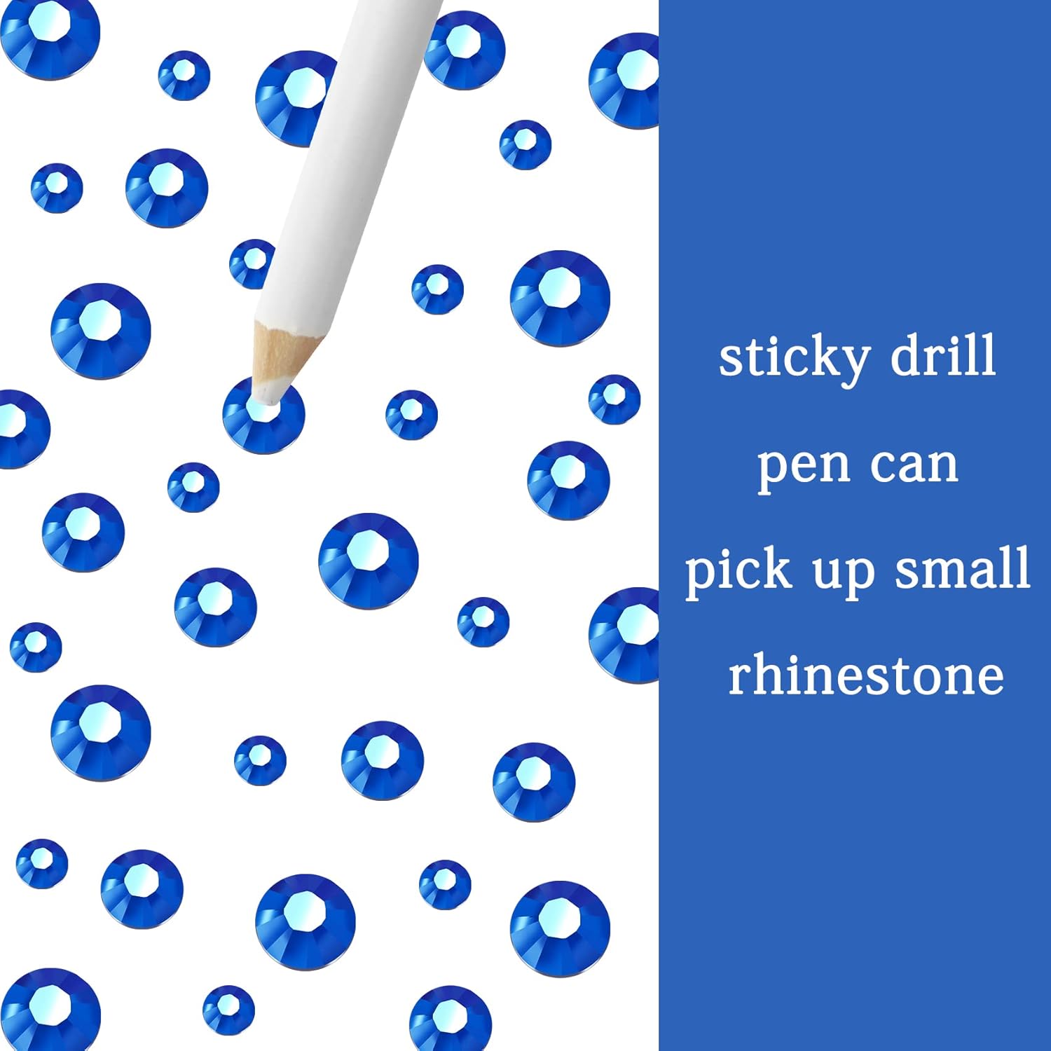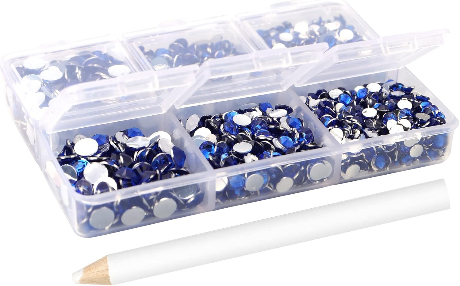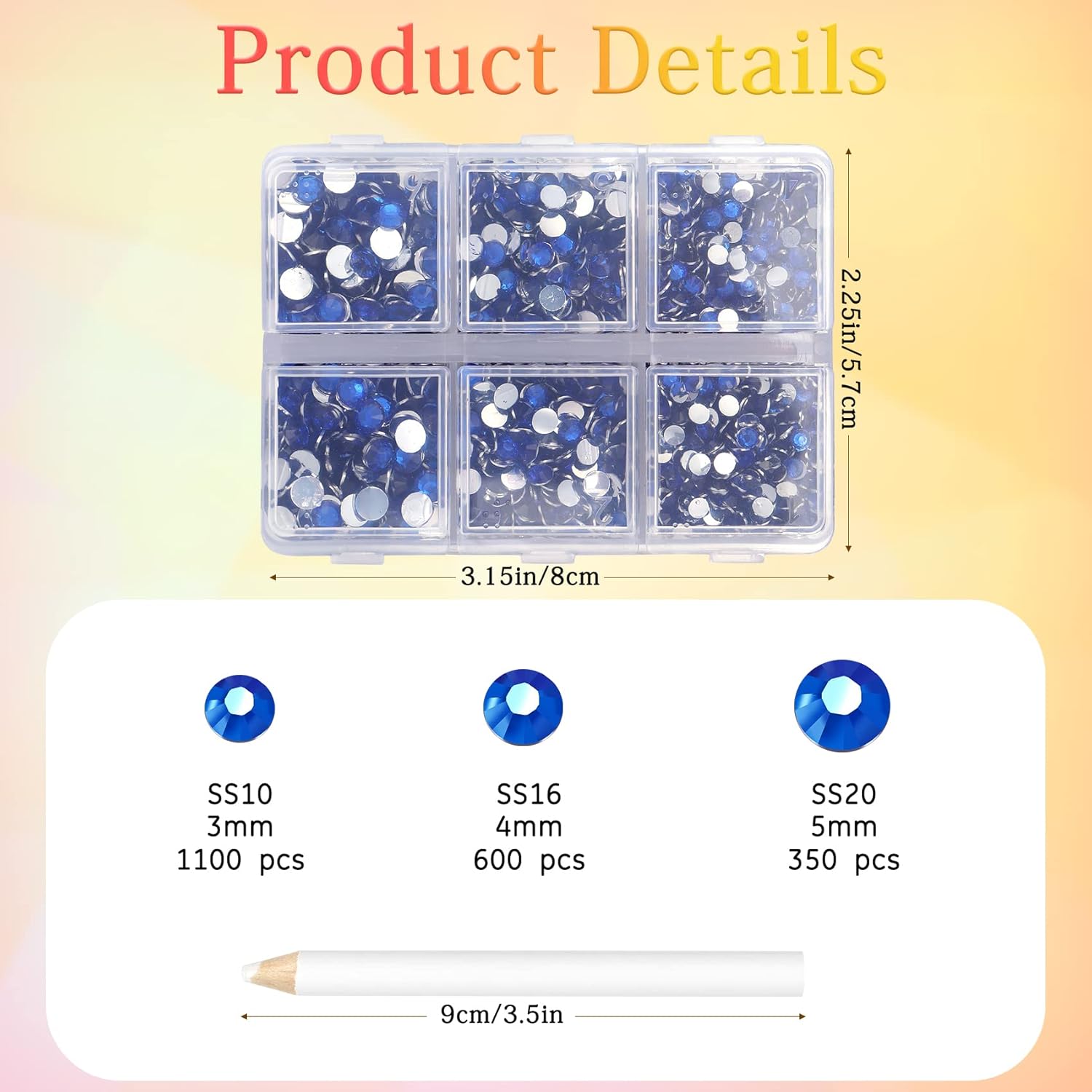 - 3 Sizes Rhinestones Set with Pick Up Pen: 2050 pcs per box. Round flat backs &Non Hotfix, SS10 (3mm) 1100PCS, SS16 (4mm) 600PCS / SS20(5mm) 350PCS.