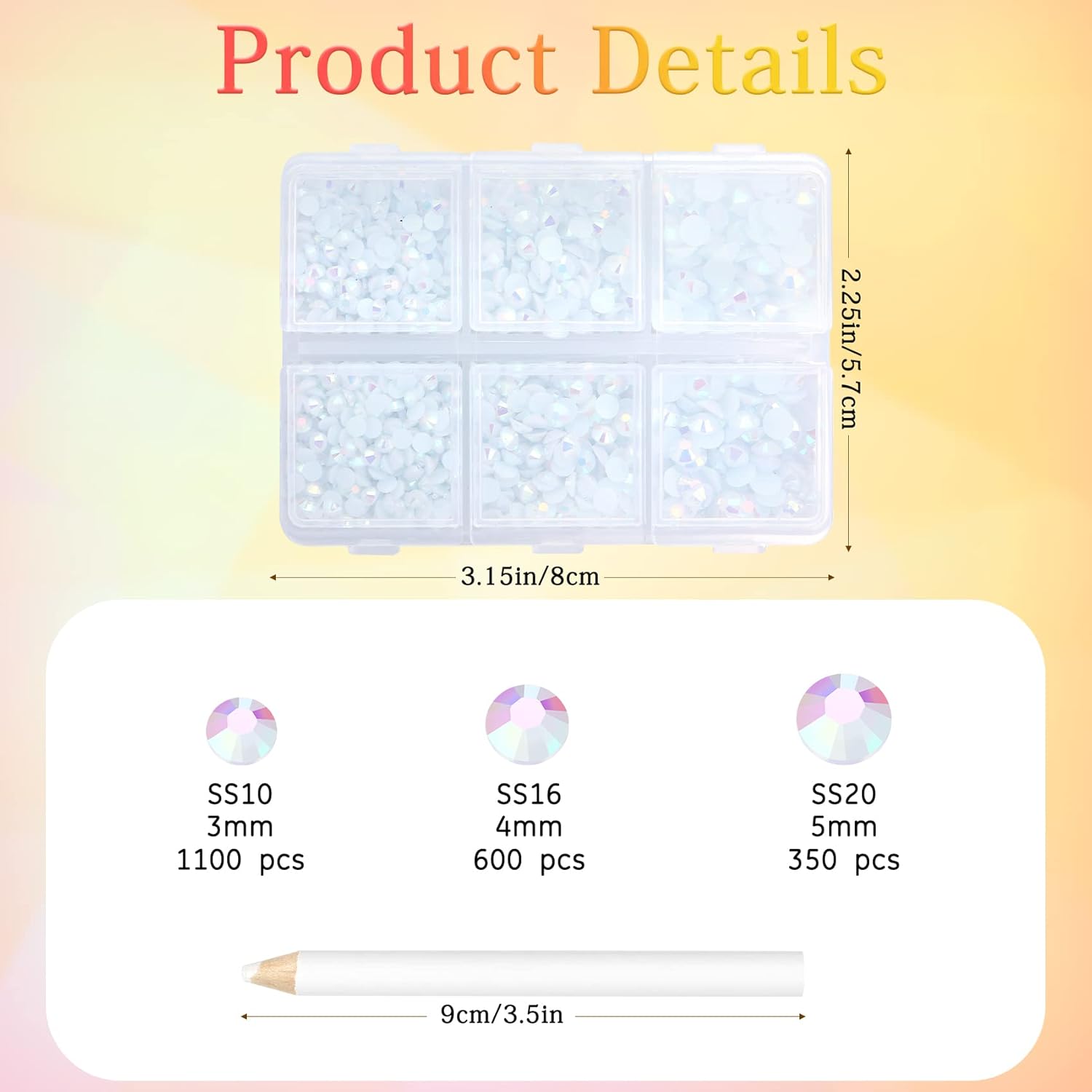 - 3 Sizes Rhinestones Set with Pick Up Pen: 2050 pcs per box. Round flat backs &Non Hotfix, SS10 (3mm) 1100PCS, SS16 (4mm) 600PCS / SS20(5mm) 350PCS.