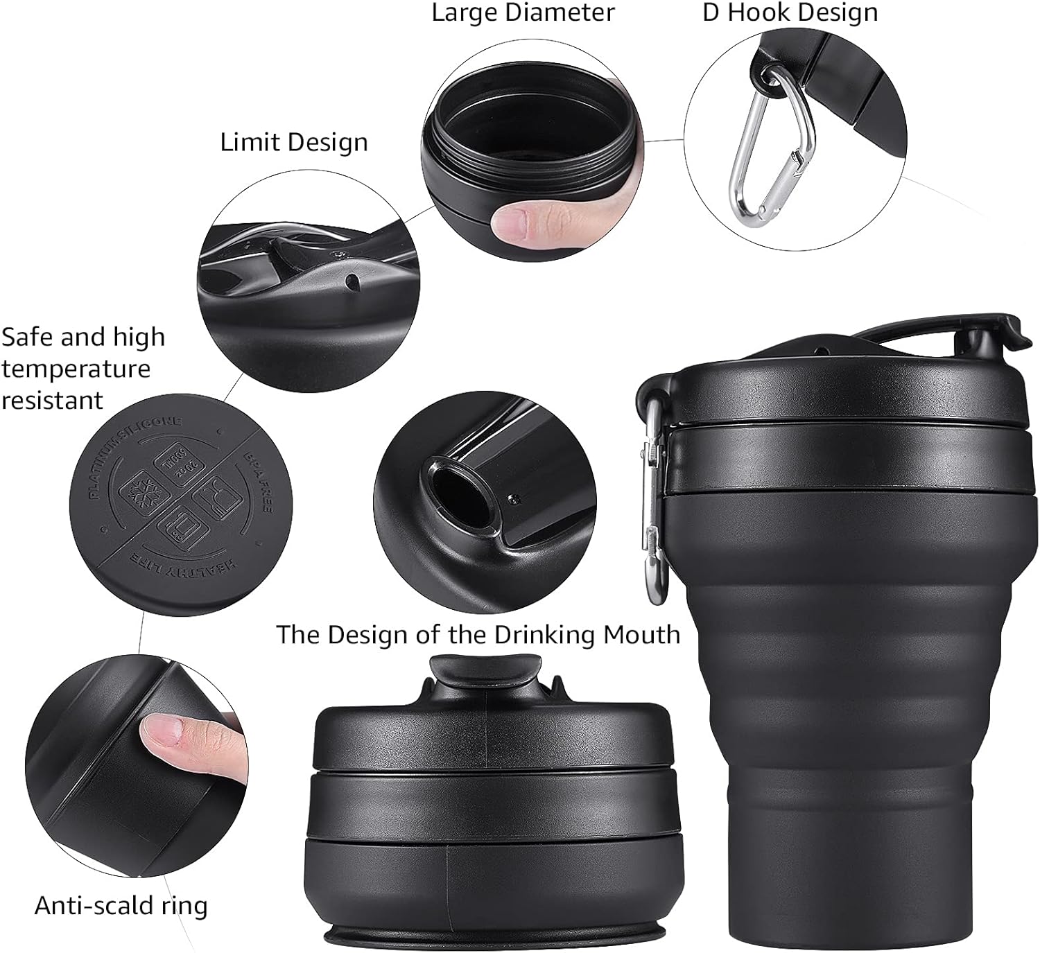 2PACK Collapsible Coffee Cup, 16 OZ 480ml Silicone Folding Camping Mug, Leak Proof BPA Free Portable Sport Bottle with Lids for hiking, Microwave & Dishwasher Safe (Black)