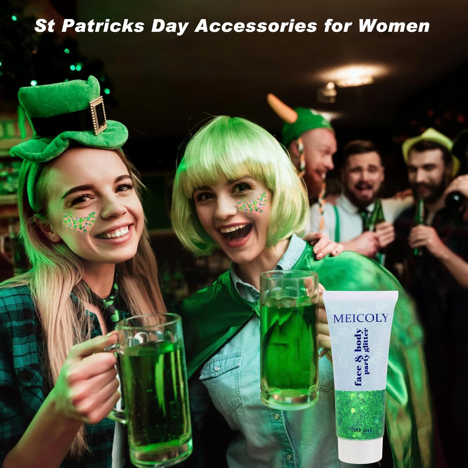 MEICOLY Green Face Body Glitter,St Patricks Day Accessories,Green Face Paint Glitter Gel Chunky Makeup,Sparkling Festival Rave Outfits for Women,Saint Patrick's Day Hair Alien Glitter
