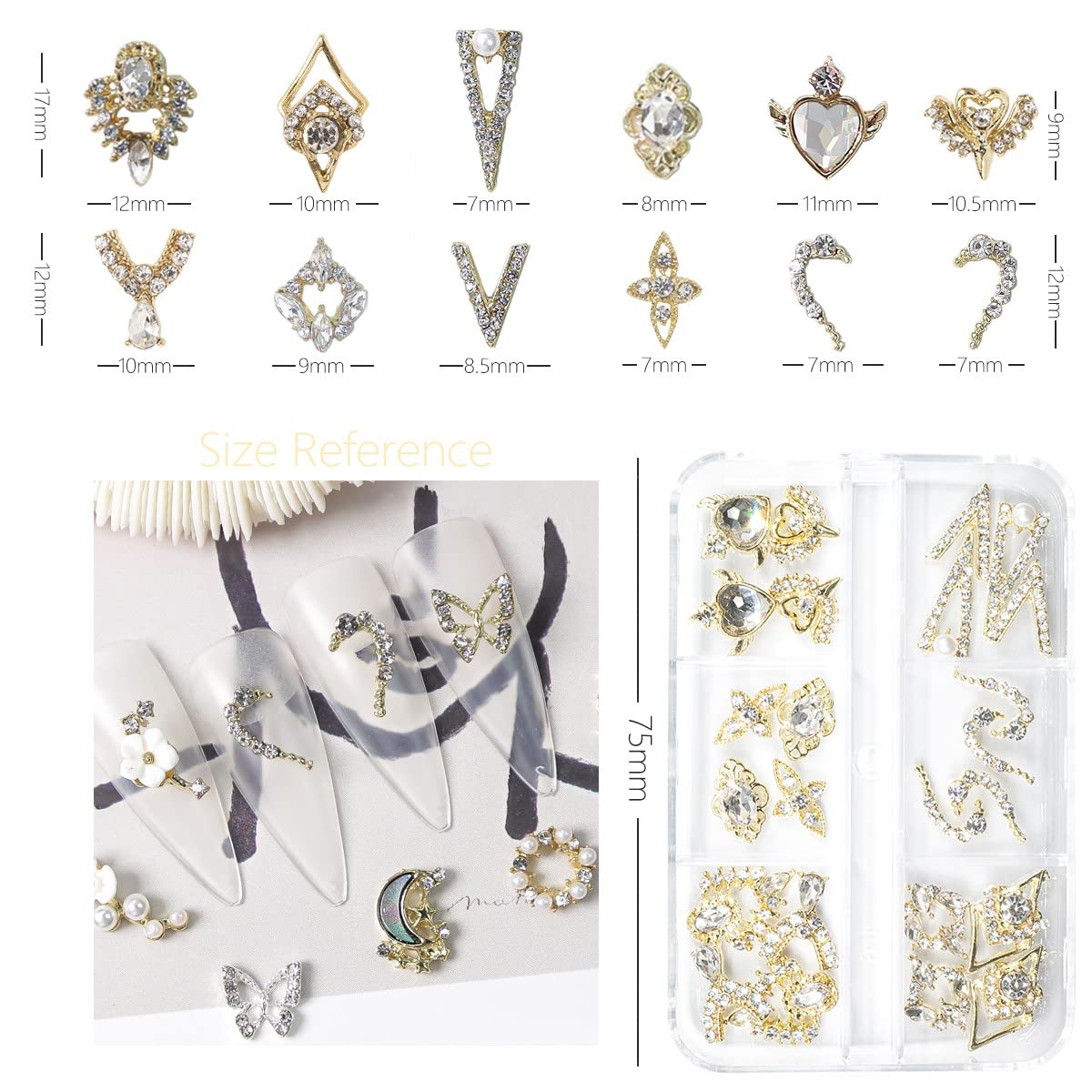 - ❤【12 Different Delicate Luxury Style Design】The gold luxury nail art supplies are designed with heart, sceptre, triangle, V-Shape, Necklace and other different shapes, inlaid with pearls, diamonds and rhinestones, looks luxurious and shiny. These nail art decoration can make your nails very elegant. The big nail charm stones will look perfect with other nail art design items, just go and show your imagination. You can combine some other qiipii rhinestones to DIY design.