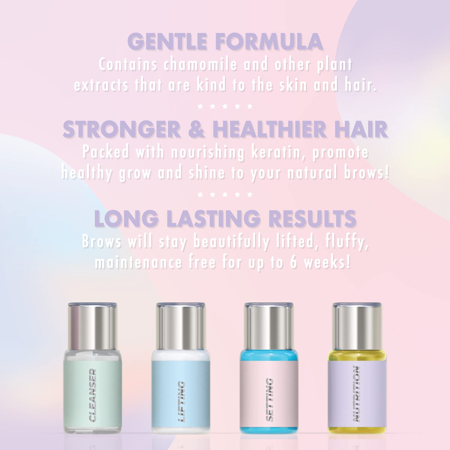 - Product Benefits : Achieve beautiful, feathery brows for up to six weeks with this gentle formula containing keratin and plant extracts, promoting healthy hair growth and providing a salon-quality brow lift at home. Achieve beautiful, feathery brows for up to six weeks with this gentle formula containing keratin and plant extracts, promoting healthy hair growth and providing a salon-quality brow lift at home.