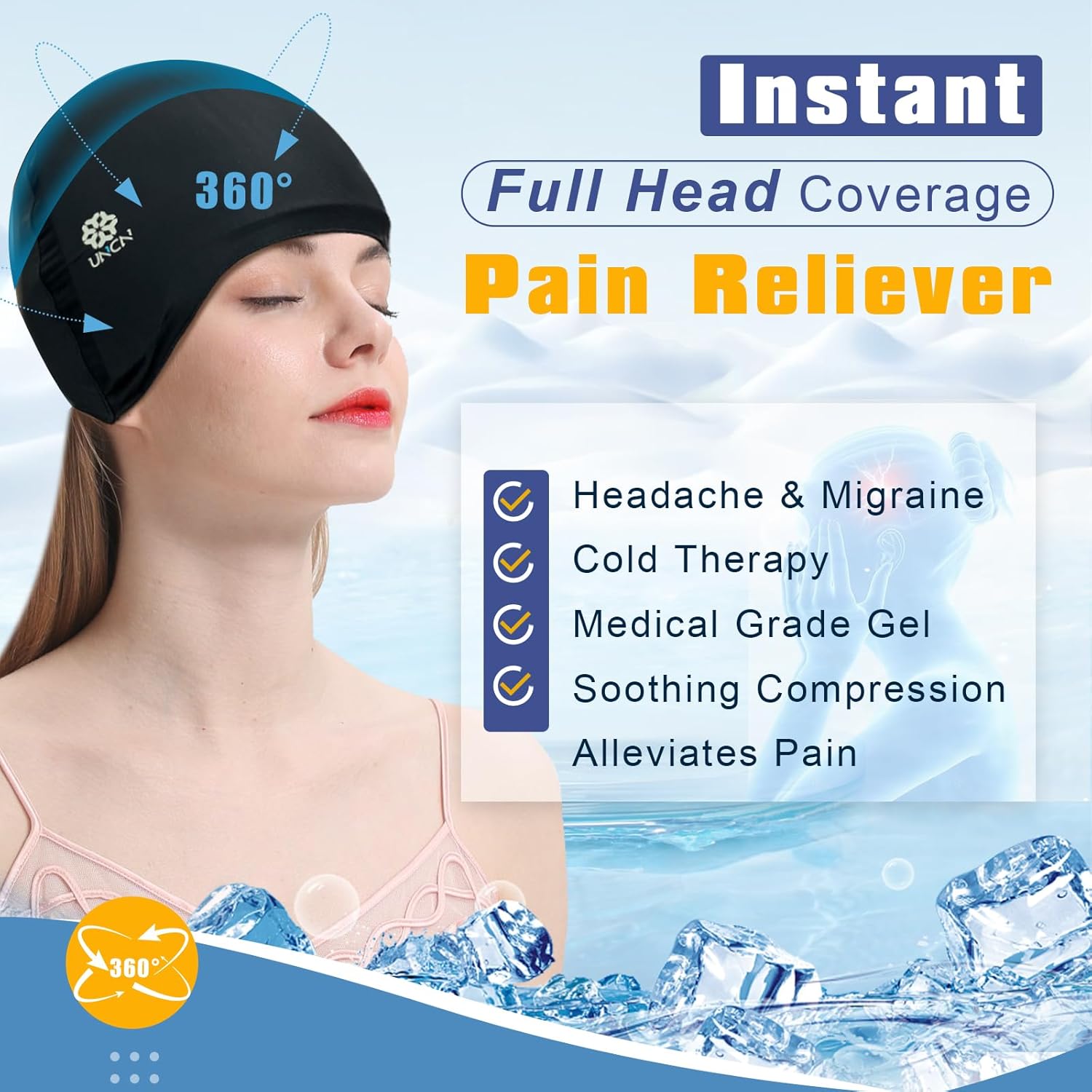 uncn Full Head Migraine Relief Hat, Ice Headache Wrap for Migraine Cooling Cap Pack Hat Compress Pad Cold Therapy for Stress, Tension, Sinus Pain Relief Reusable Physical Relief