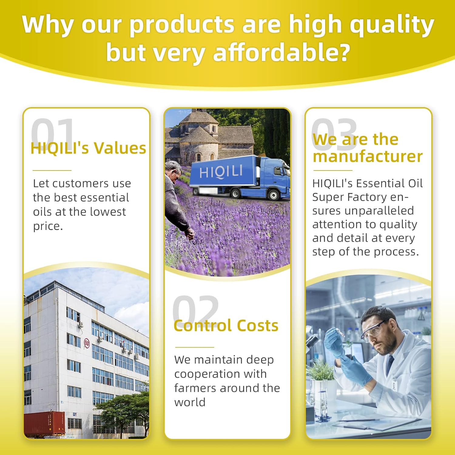 - About HIQILI:We work with farmers in more than 30 countries around the world to achieve sustainable development by providing cost-effective essential oils to meet the needs of today's consumers