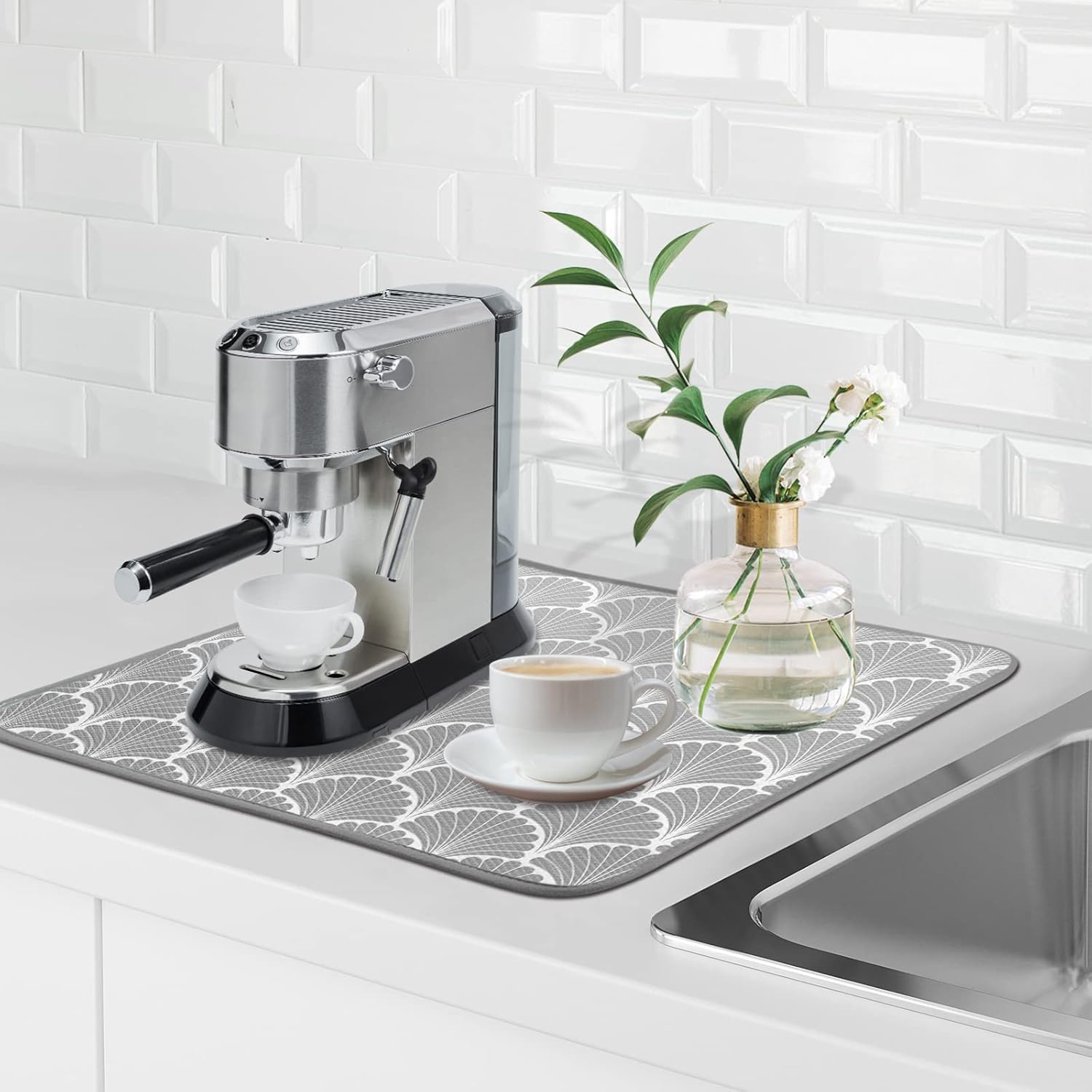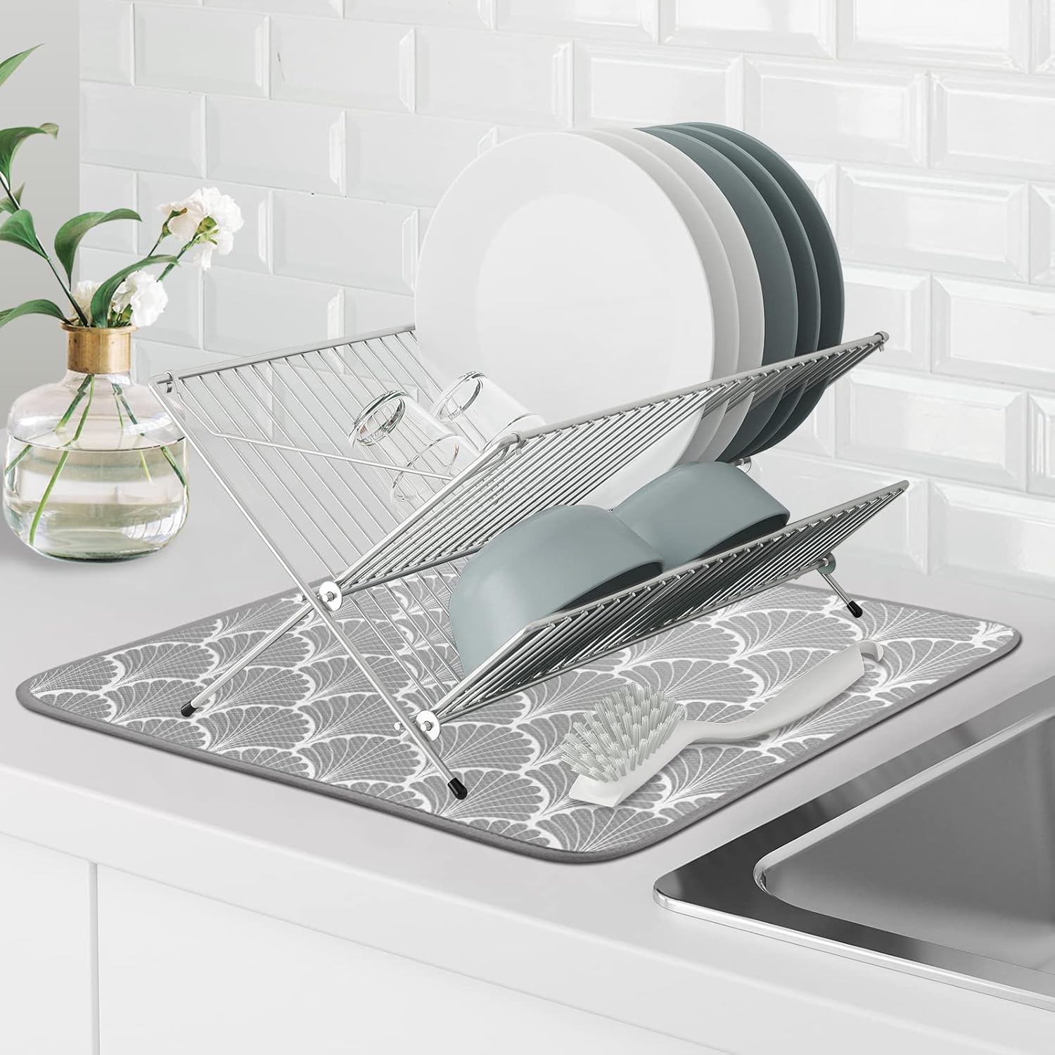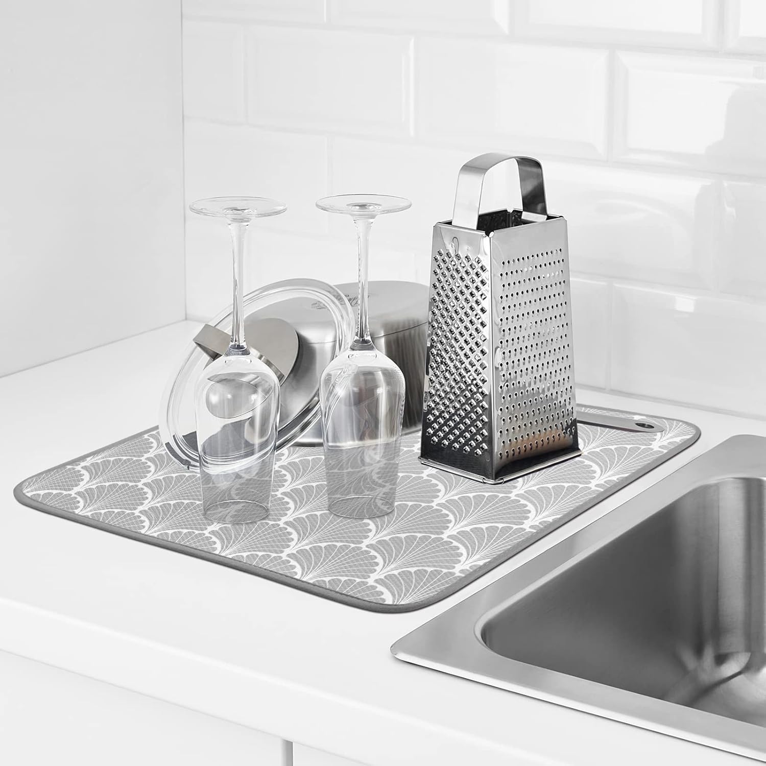 SHIYUE Dish Drying Mat for Kitchen Counter Super Absorbent Spring Kitchen Decor Microfiber Drying Matainers Rack Fast Pad Dish Drainer Mats(Grey Shell Geometric,16''x18'')