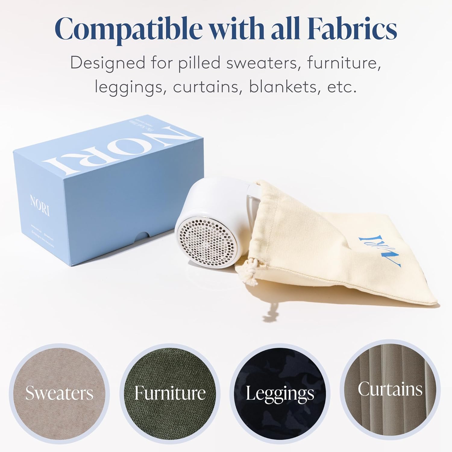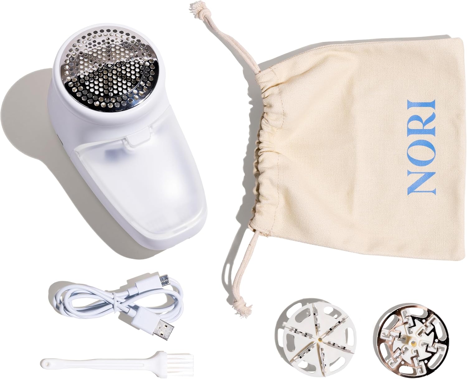 Nori Trim Fabric Shaver - Lint Remover for Clothes & Furniture Couch Pilling - Sweater Pill Remover - Clothes Shaver with 6 Precision Blades - Wireless and Rechargeable - White