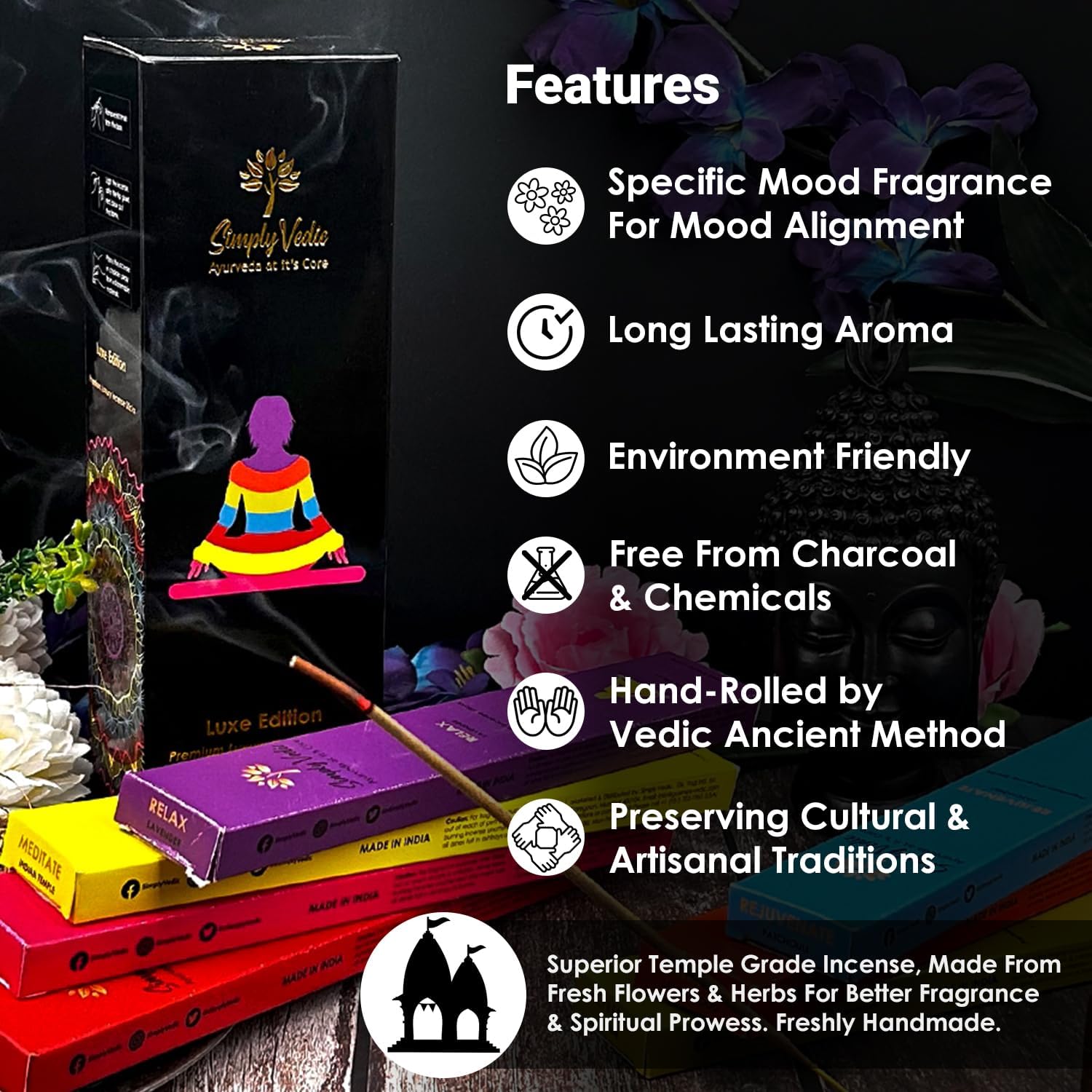 - 🌸 Handcrafted Using Traditional Vedic Methods 🌸 Our incense is handmade in India by skilled artisans using traditional Ayurvedic recipes. Every stick reflects sacred craftsmanship, offering temple-grade incense rooted in centuries of ritual and purity.