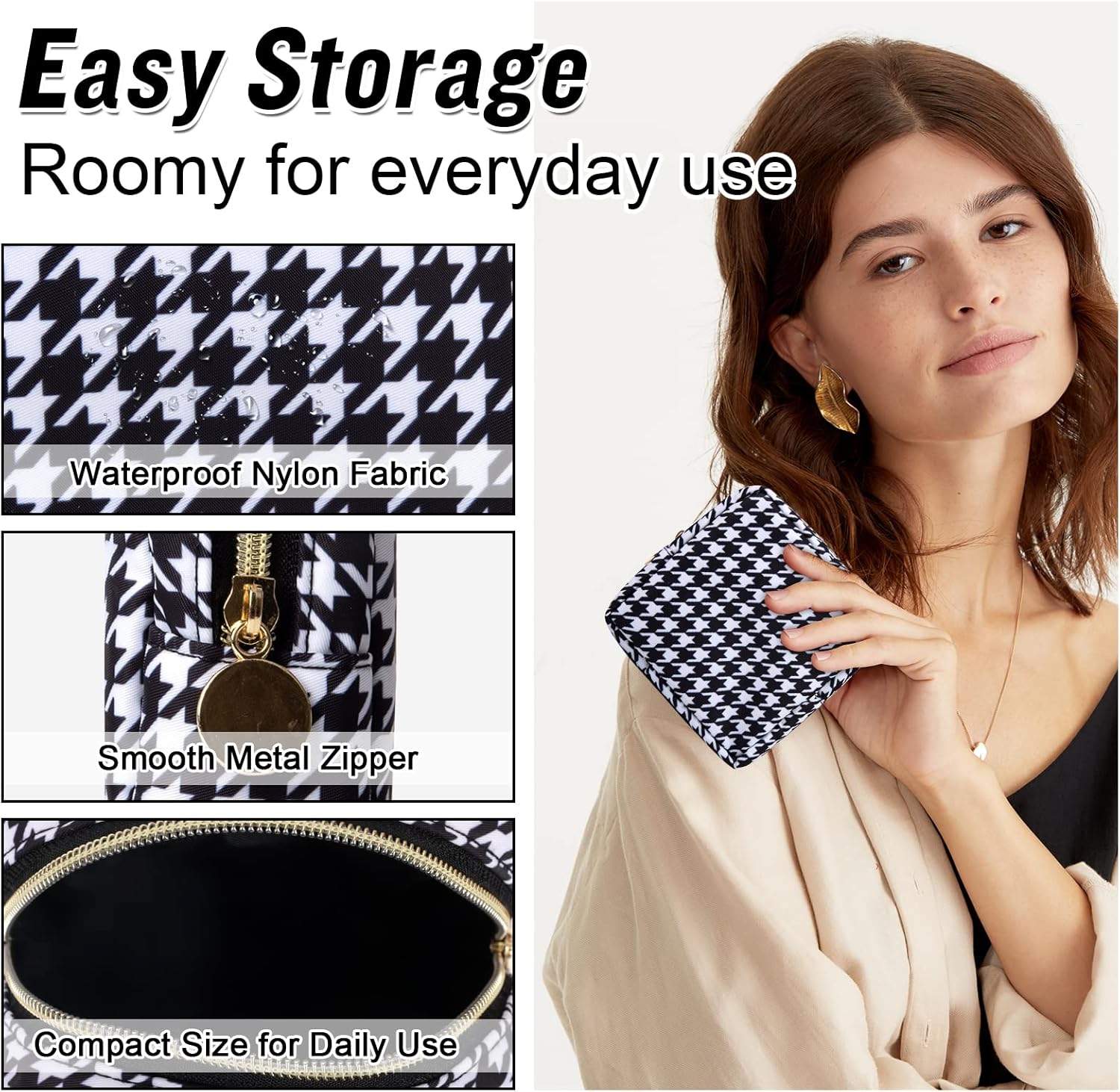 Nylon Mini Makeup Bag for Purse, Small Cute Makeup Bag Preppy Cosmetic Zipper Pouch Purse, Waterproof Travel Coin Pouch Sanitary Napkin Storage Bag Makeup Organizer for Women Girls(Black Houndstooth)