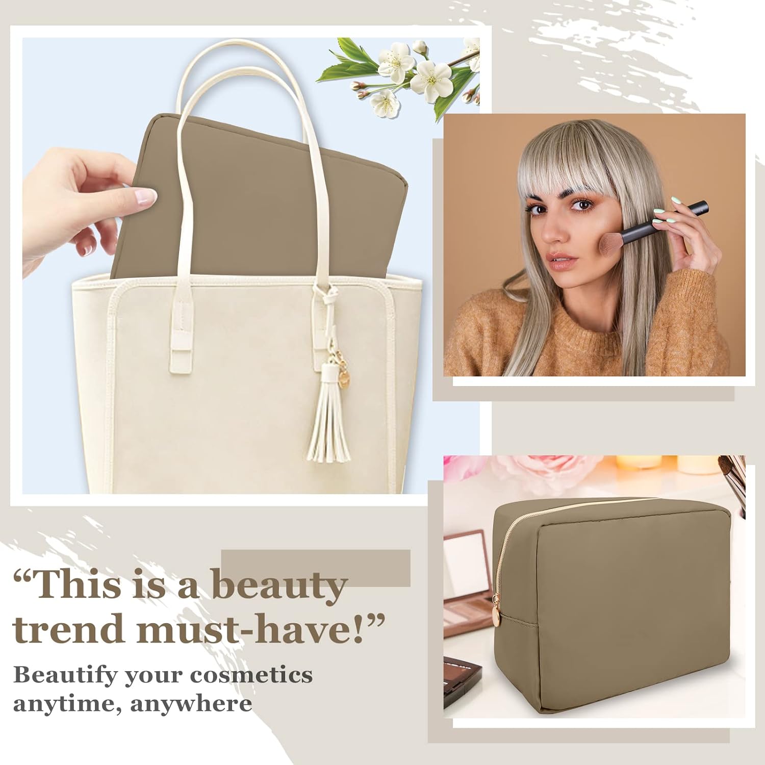 Nylon Large Makeup Bag Travel Pouch for Women, Preppy Big Makeup Bag Cute Cosmetic Zipper Pouch Purse, DIY Chenille Letter Bag Waterproof Toiletry Bag Clutch Make Up Organizer for Women Girls(Khaki)