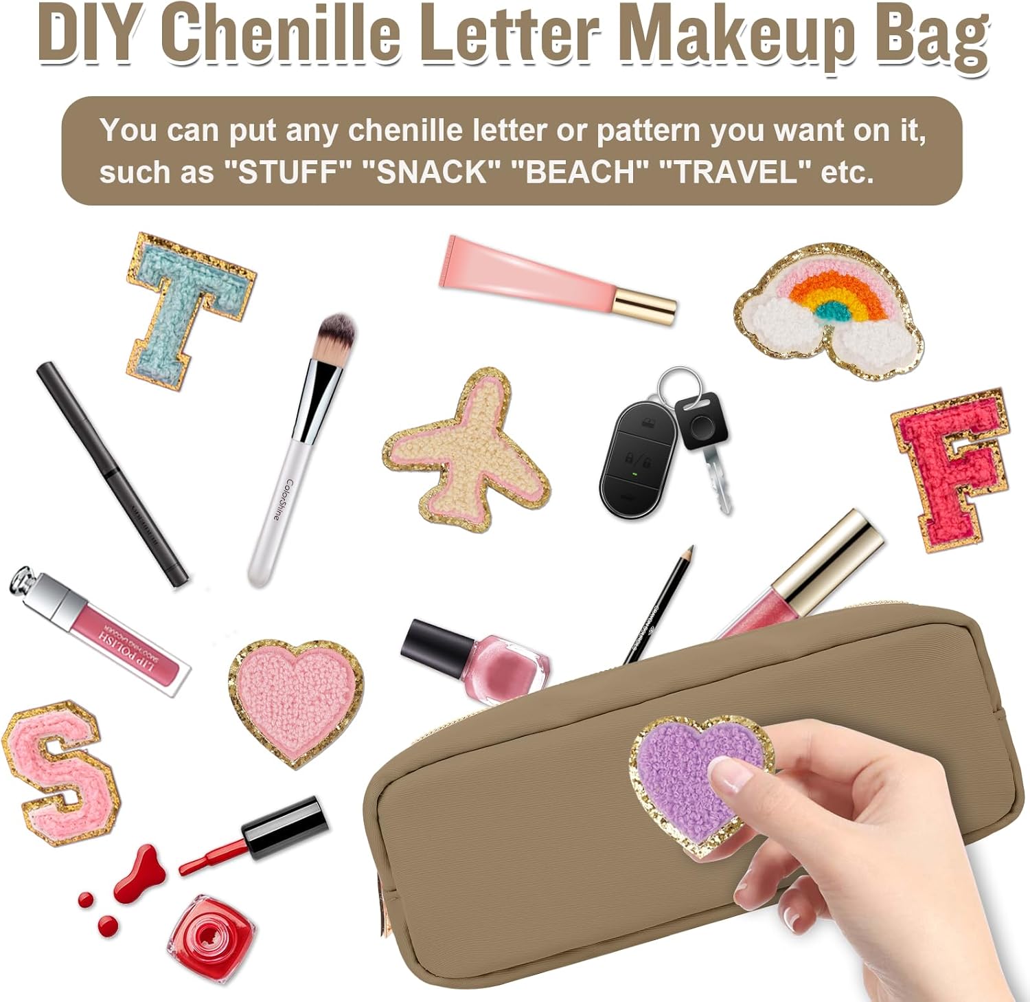 - ❤【DIY Your Bag & Patches Friendly】Slim compact makeup bag material allows you to easily attach your favorite patches and fits all travel toiletries. You can put any chenille letters or patterns you want on it, "STUFF" SNACK "BEACH" and so on to design your unique travel makeup bag. Make your preppy makeup bag very interesting and vivid!