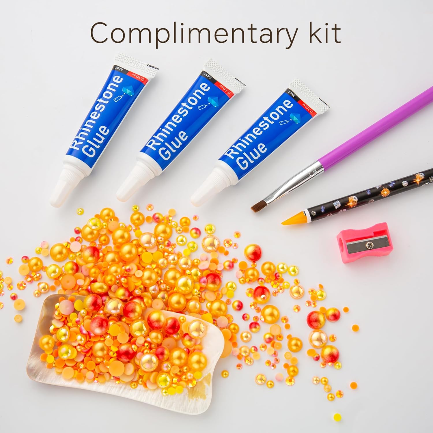 - What You Will Receive: 60g(30g*2)mixed size flat back pearls and rhinestones. 3*Rhinestone Glue. 1* wax pencil for rhinestones. 1*Pencil sharpener(color random). The mix half round pearls and rhinestones can make more beautiful handicrafts for your friends, parents, yourselfs on any festivals.If you need a mixed size pack of pearl rhinestones