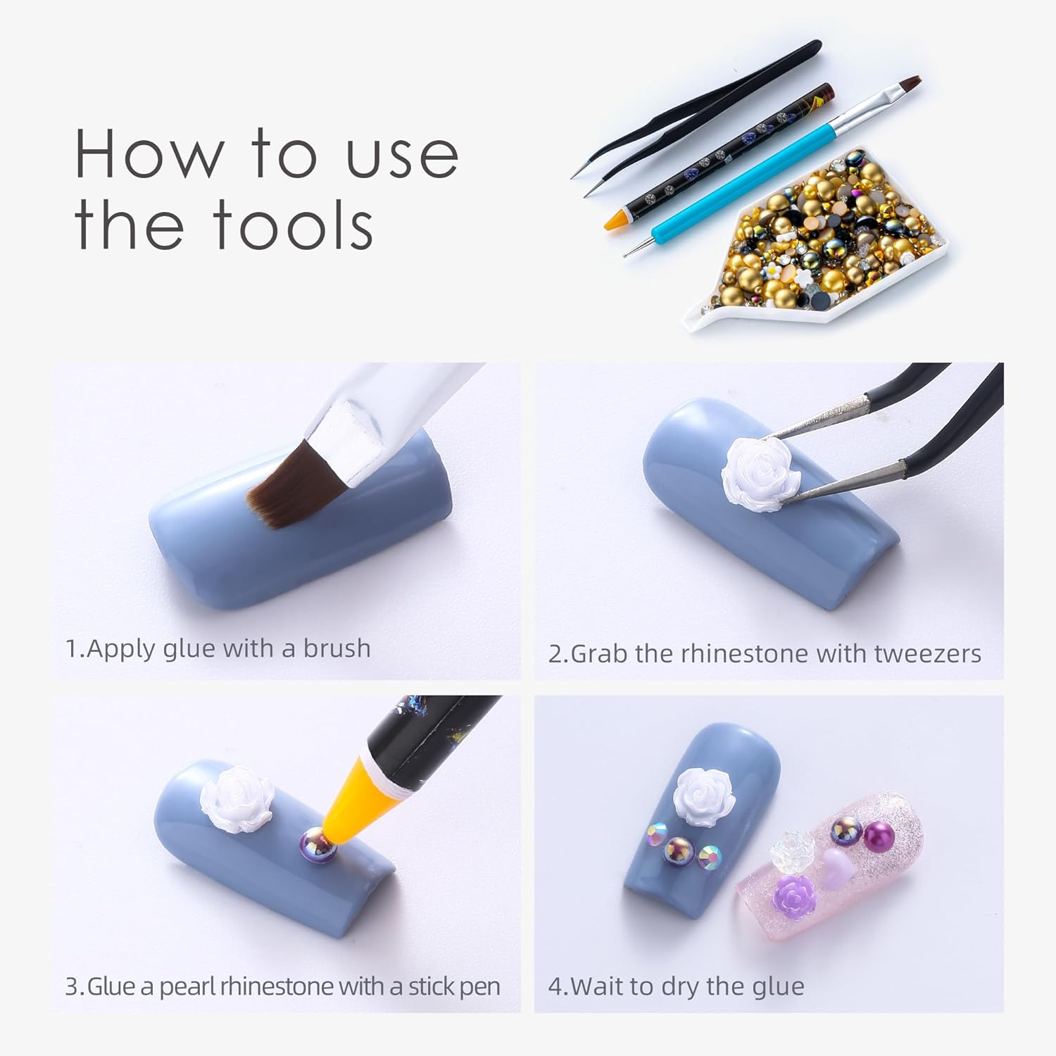 - Useful tools - These pearls and rhinestones have a flat back, which is excellent for easy placement.and you can pick up any large or small pearls and rhinestones with the crayons we bring along. And use the brush to smooth out the Gel, these tools will work very well