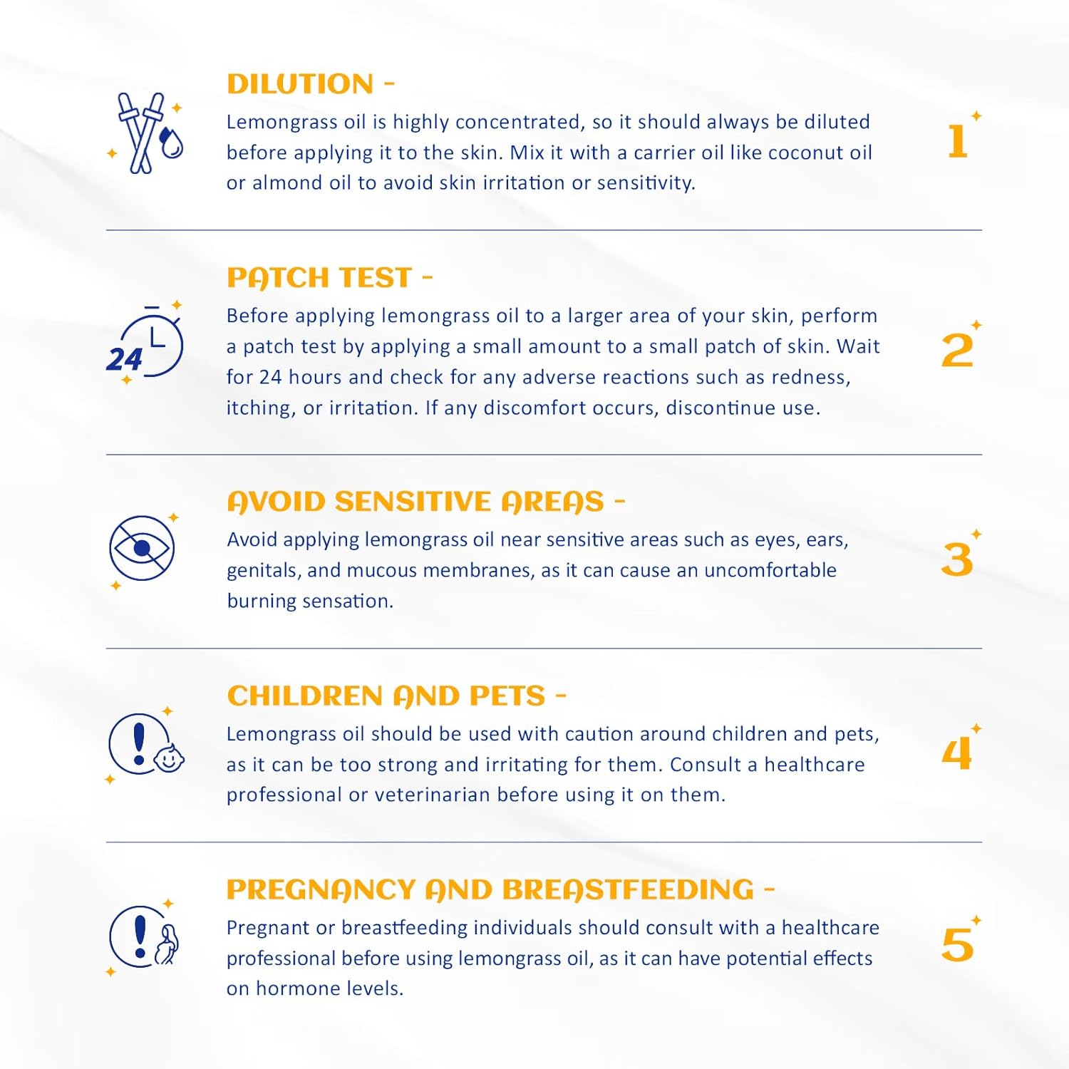 - Body Massage: Mix 2-3 drops of lemon grass oil essential oil with 10 to 20 drops of carrier oil (sweet almond, grapeseed or jojoba). Take an appropriate amount of the oil blend into your palm and apply it in circular motions on the parts of the body that need to be massaged to relax the body and mind, relieving pain in overworked or tired muscles
