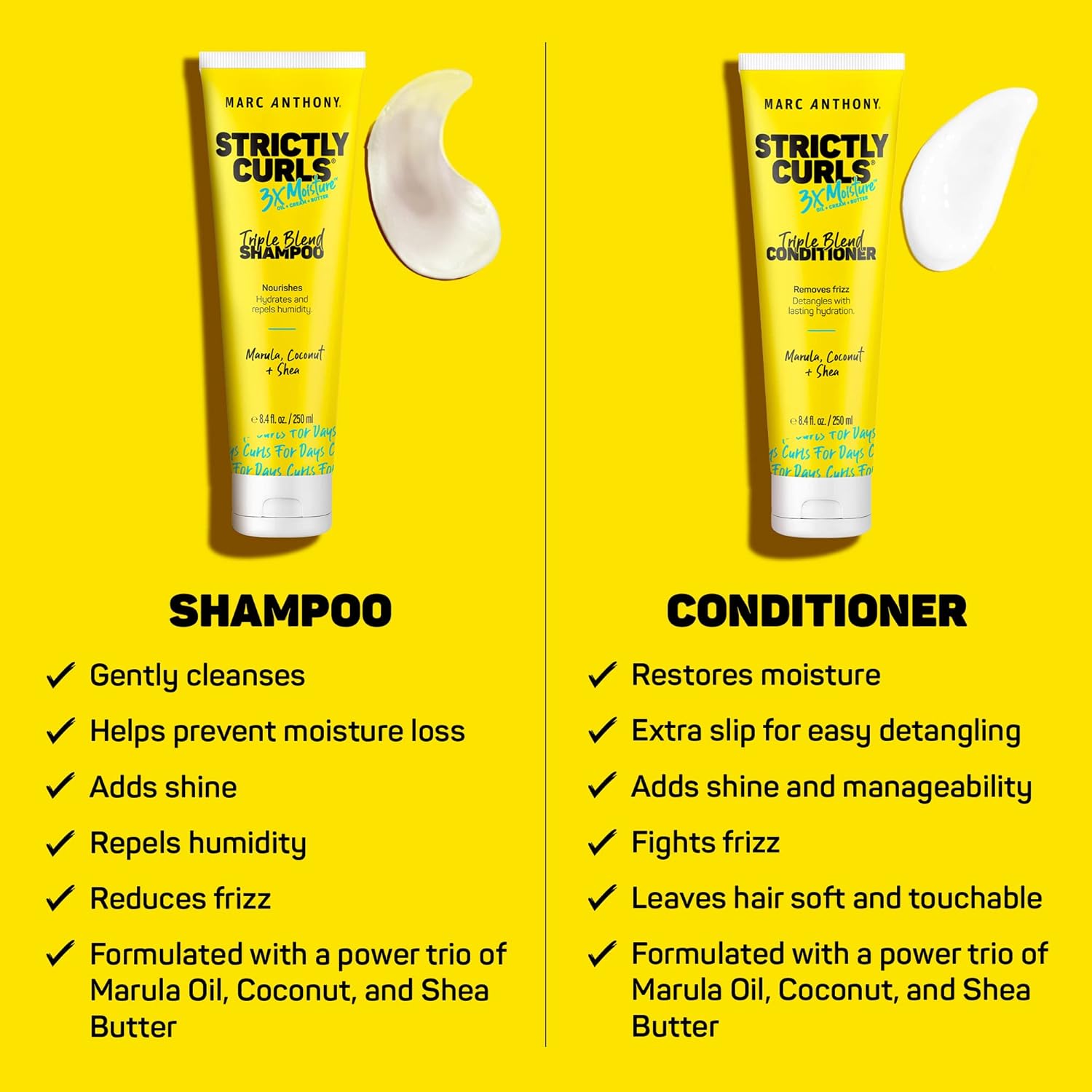 - Strictly Curls 3X Moisture Shampoo & Conditioner Set: Curls know what they like. And so do we! Formulated with a triple blend of Marula Oil, Coconut and Shea butter, this shampoo and conditioner set from Marc Anthony will give your curls the gentle care and extra moisture they need without getting in the way of their bounce. 8.4 fl oz each.