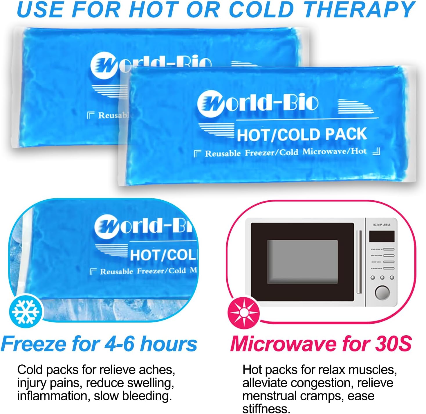 - Hot Cold Gel Packs Reusable - Our flexible soft ice packs can be used for both hot and cold therapy. Place the soft ice pack in the freezer for cold therapy to help with sprains, strains, and for post-surgery recovery, and to reduce swelling. Heat it in the microwave for hot therapy to relieve stiffness, increase blood circulation, and relax muscles.