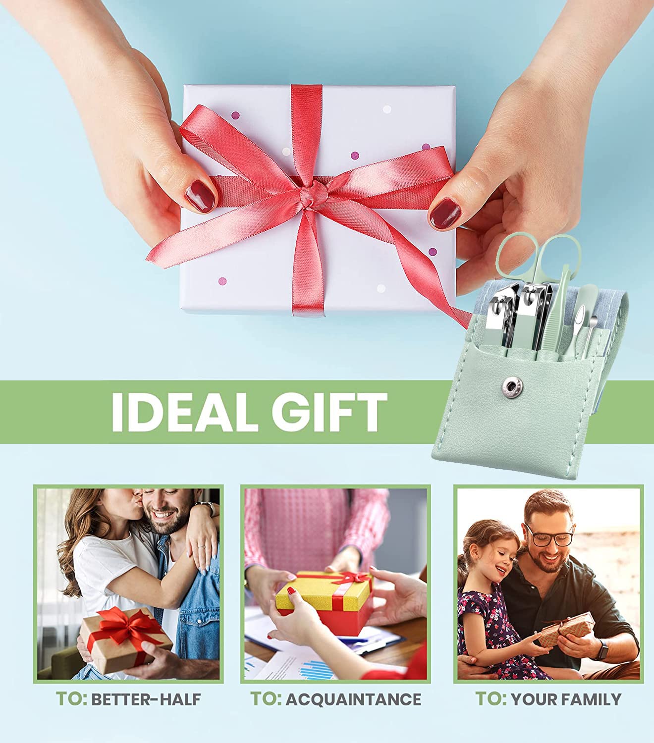 - Portable Grooming Kit: with a green leather bag, very lightweight so you can take it wherever you go for quick touch-ups or full nail care sessions.
