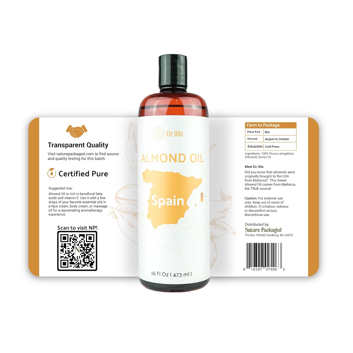 Sweet Almond Oil (16 oz) - for Skin and Hair - Carrier Oil for Essential Oils Mixing - From EIR Oils' Farm in Mallorca, Spain - 1 Pack