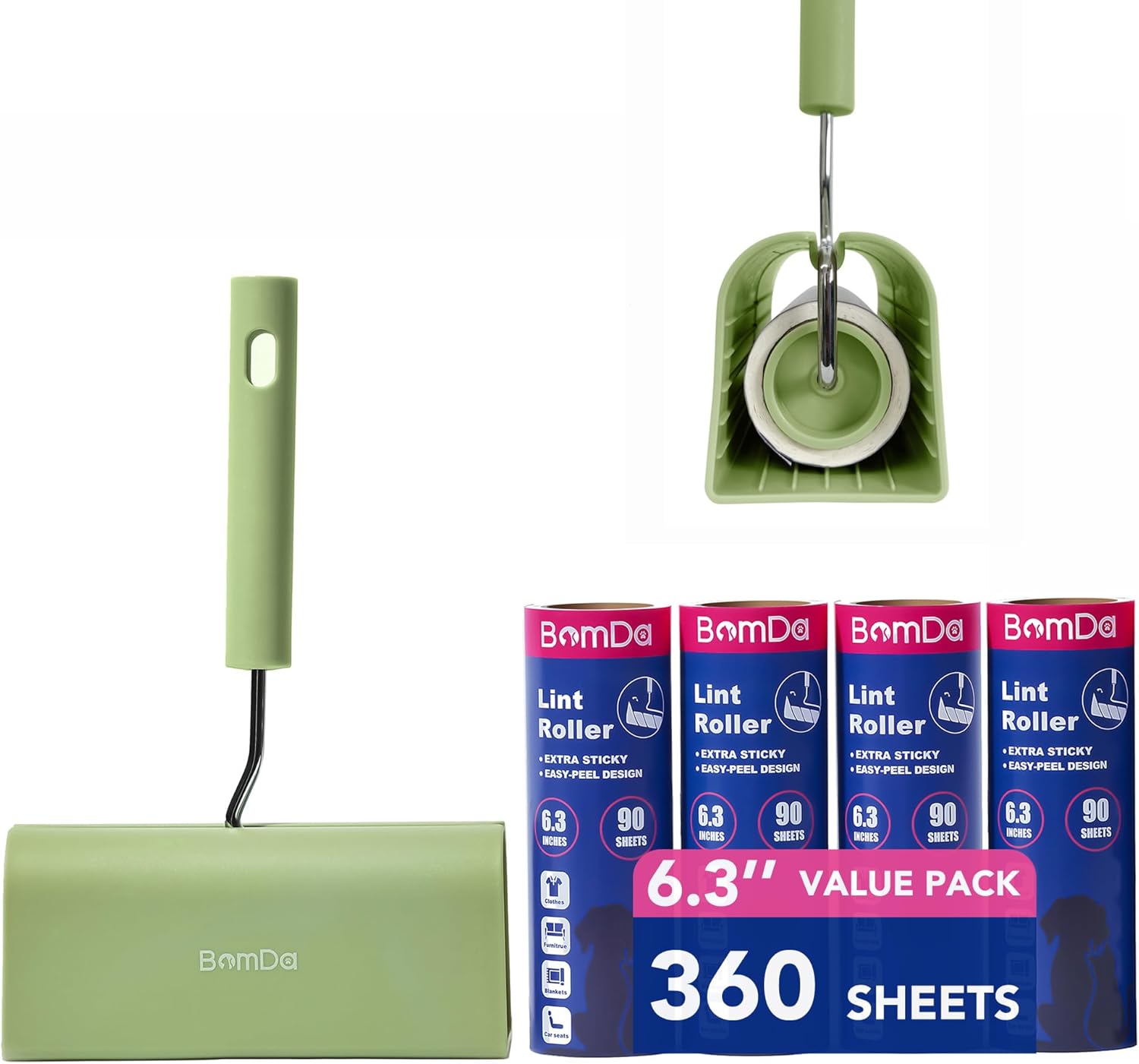 Extra Sticky Large Surface Lint Roller, 6.3'' Giant Lint Roller for Pet Hair, 360 Sheets/ 4 Refills, Long Handle Lint Remover for Clothes, Furniture (1 Roller + 360 Sheets)