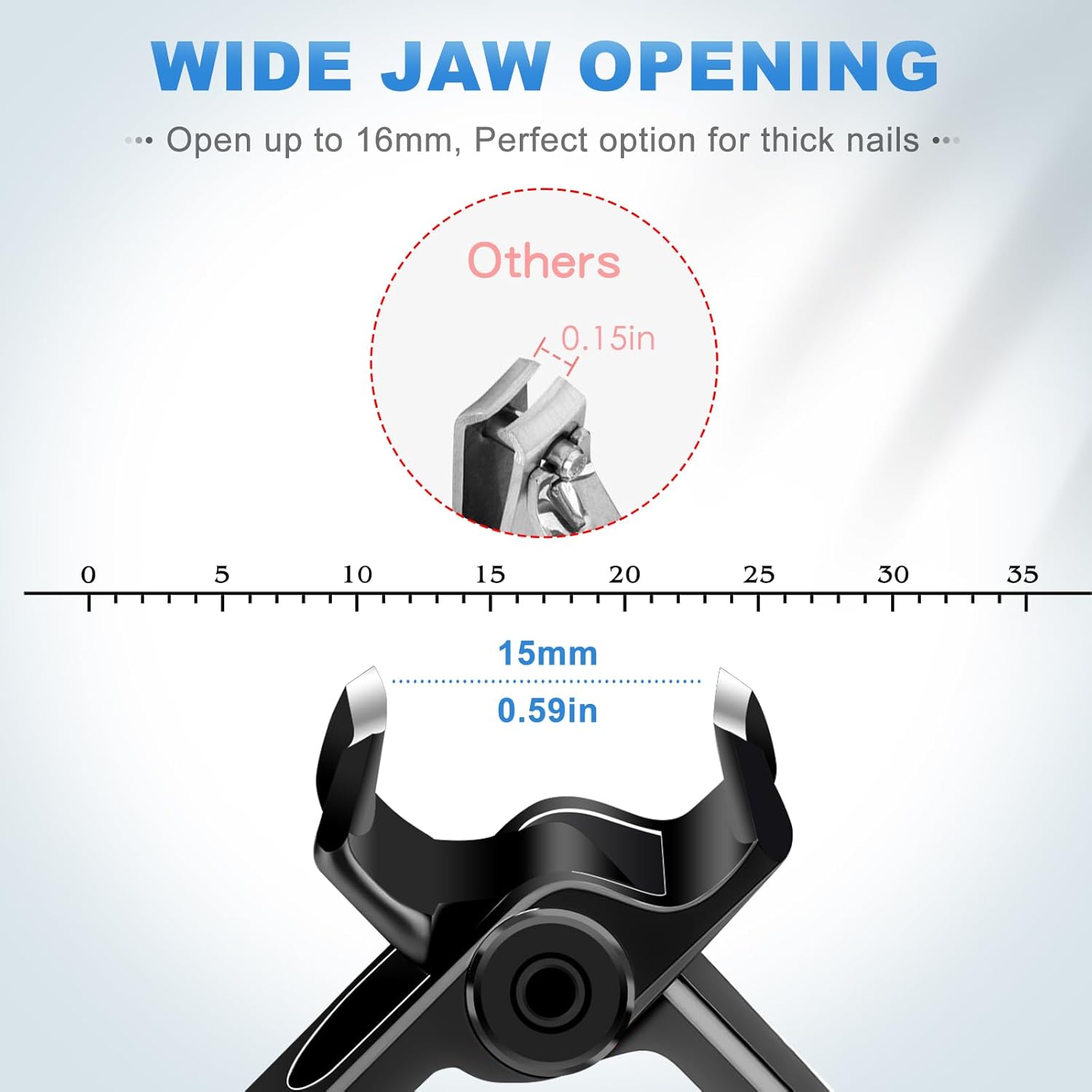 - Wide Jaw Opening for Thick Nails - Large size toenail clippers could open cutting mouth so wide up to 15mm/0.59in, easier to trim thick fingernails or toenails than regular nail clippers. It is great for the elderly, men, women, adult, teen, and special for seniors with thick toenails.