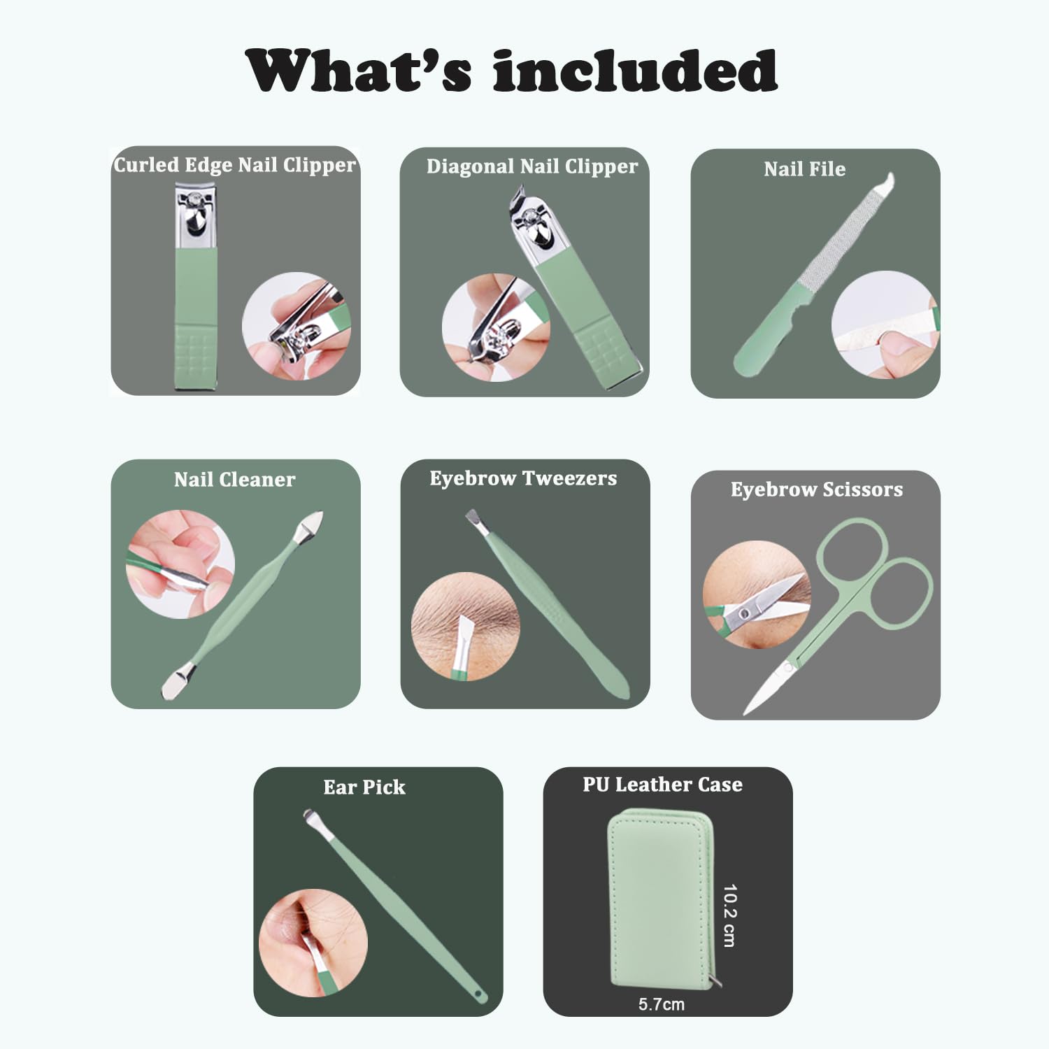 - COMFORTABLE EXPERIENCE: Our mini manicure kit conforms to Ergonomics: It has suitable size(10.2x5.7x2.5cm),lightweight(87g) rounded corners, very comfortable to the touch, sharp and efficient nail tools easily cuts nails clean with ease, eyebrow scissors, tweezers and ear pick can effectively keeps your face clean and tidy.