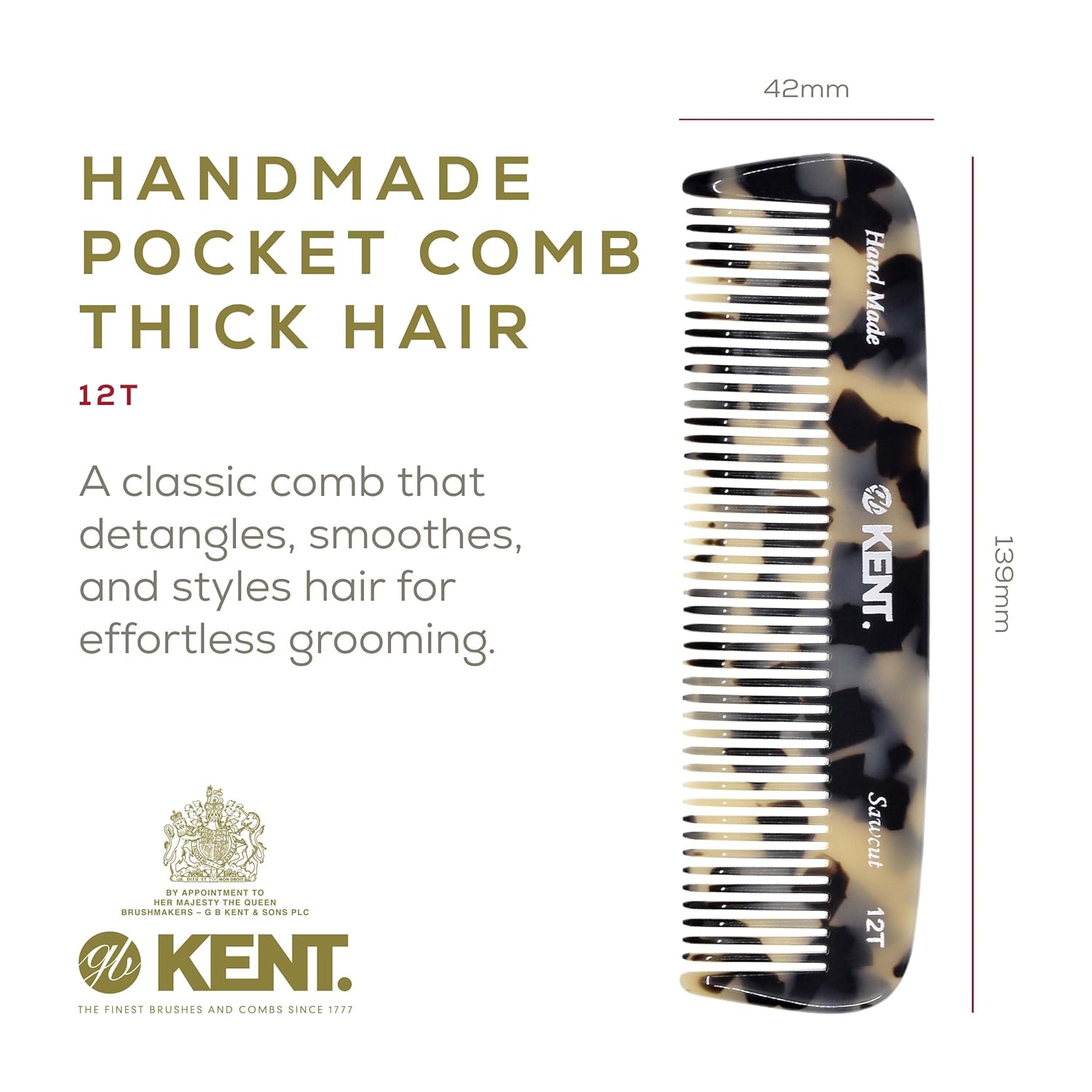 Kent 12T TW Pocket Comb - Handmade Wide Tooth Hair Comb for Men, Women, and Kids - Travel, Beard, and Mustache Comb - Saw Cut and Hand Polished Made in England