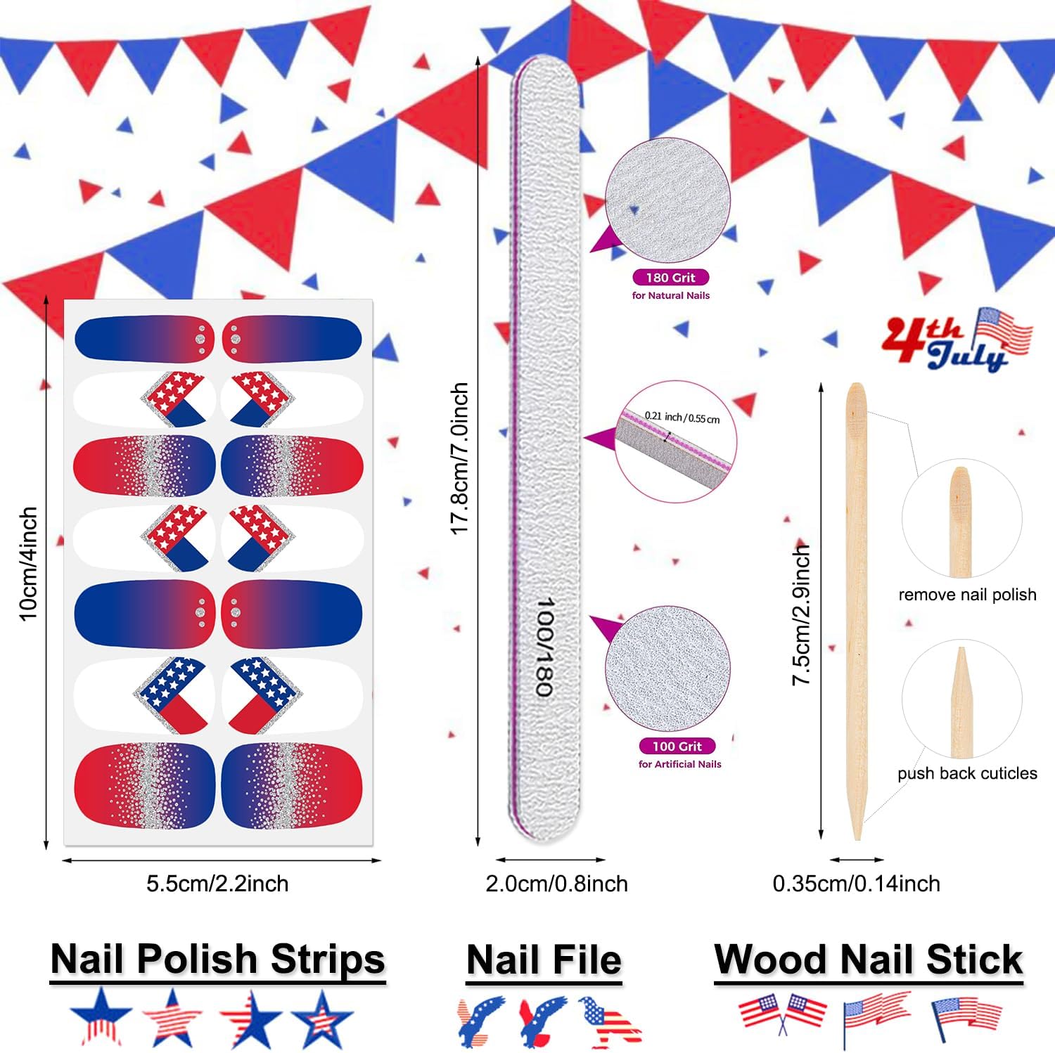 - [Easy To Use] 4th of July nail polish strips is self-adhesive quality viscose, it can be stick directly on nails, more duration and easy to remove. suitable for nail art course/nail art artist and personal use, etc.