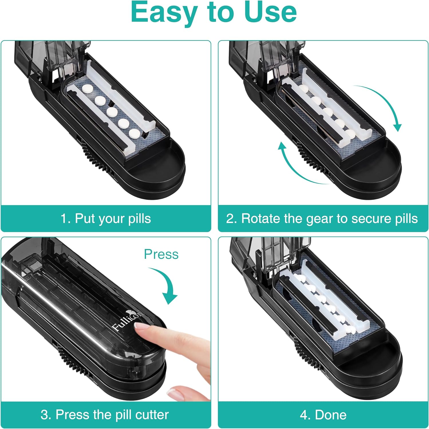 Fullicon Pill Cutter, Adjustable Cutter with precision alignment, Stainless Steel Blade & Guard, Splitter with Free Brush & Pill Box (Black)