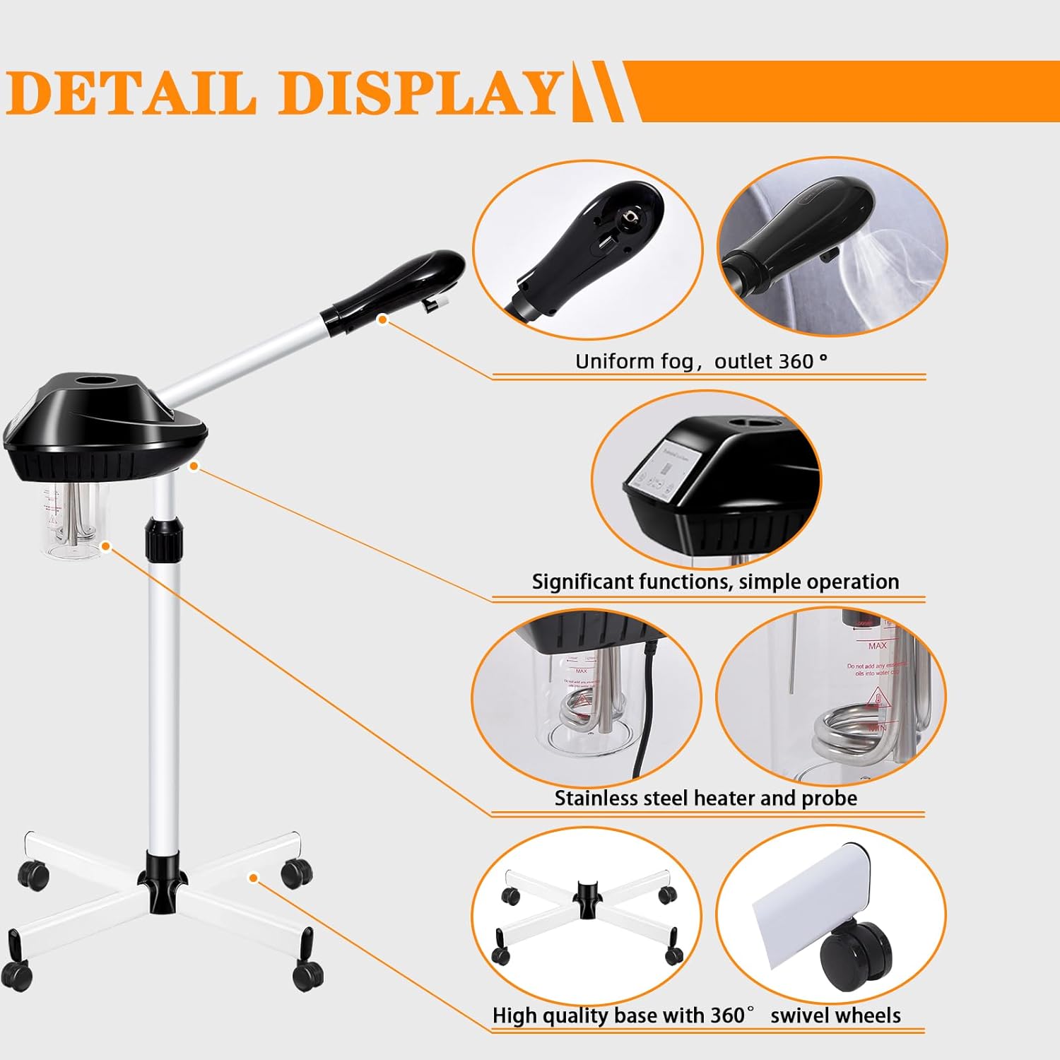 - 【Facial Steamer Professional】Our facial steamer comes with an upgraded atomizing cartridge, removable 500 ML water cup, 36-52 inch adjustable height, 360° rotating nozzle, and 360° rotating body.