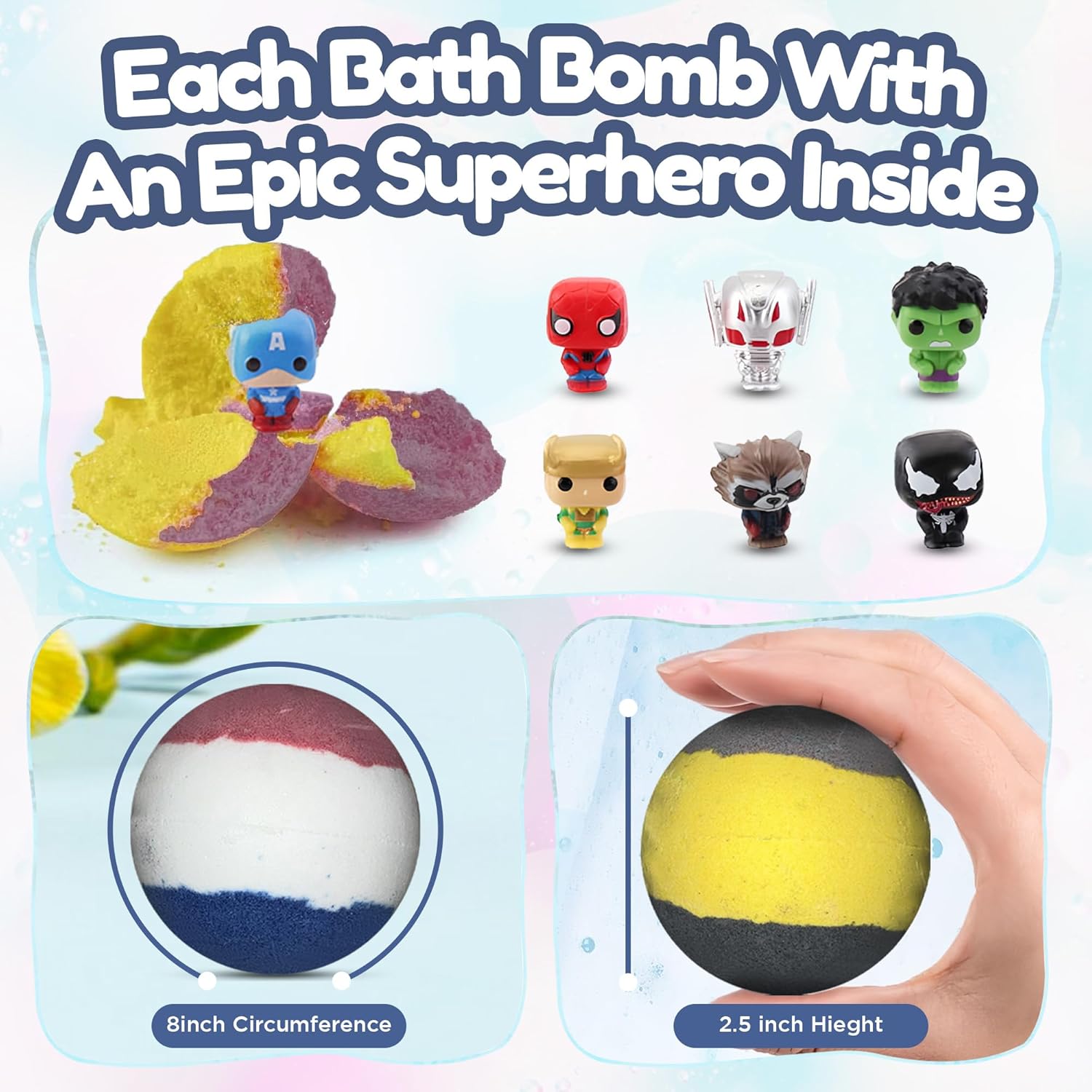 - Make Bathtime Fun - Have an epic superhero bath bombs adventure with 6 extra large superhero boy bath bombs with toys inside. These organic kids bath bombs for boys & girls are made from natural ingredients. Ideal sensitive skin bath bombs for kids.