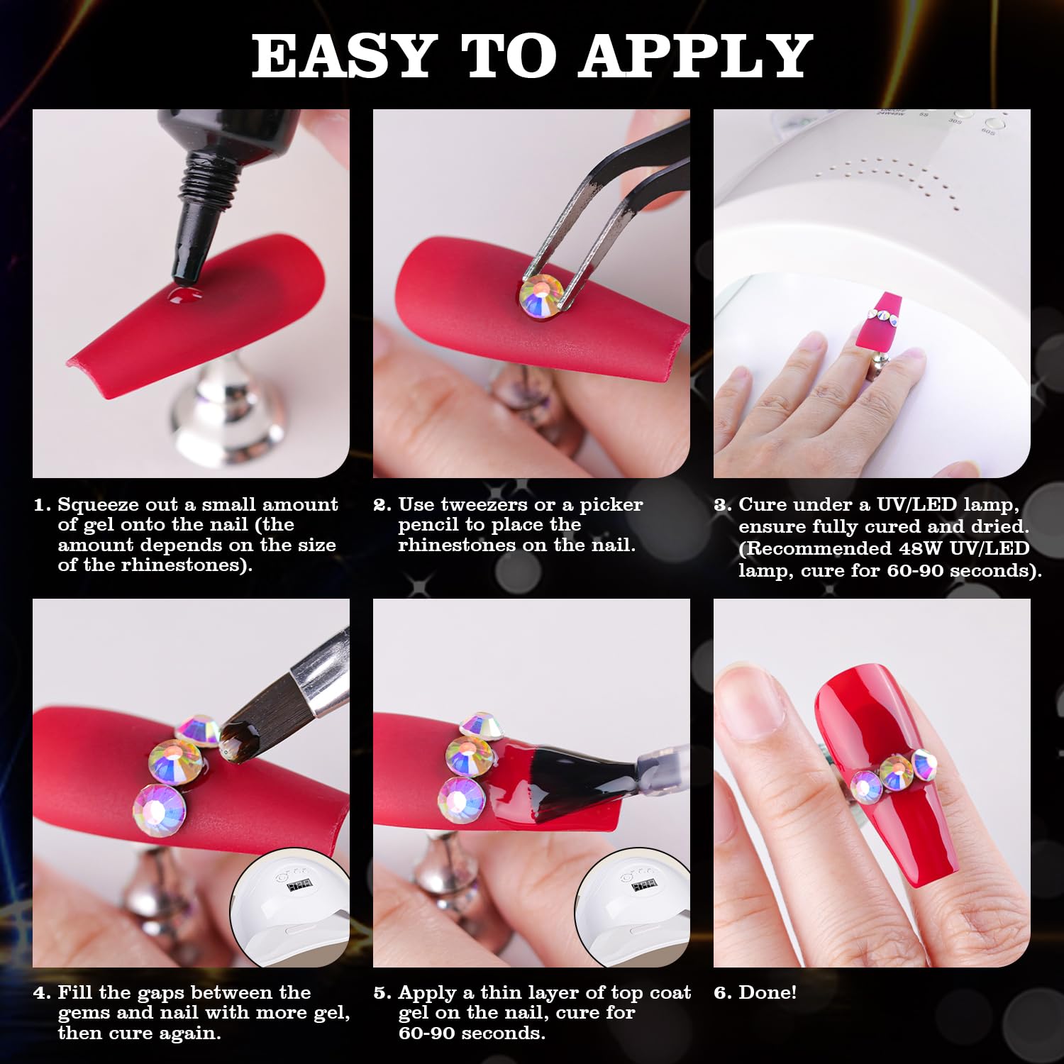 - đź’ŽADHESIVE GEL GLUE: The crystal clear nail gem glue uses a special, non-toxic and eco-friendly formula with strong tackiness, adhesion, and fluidity for easily applying decorations. It is a type of UV gel glue. After proper curing under a UV/LED lamp, the glue dries clear with superior bonding strength that can last weeks without falling off. With the designed tip, you can easily and conveniently apply the glue to the nail bed or the surface of false nails.