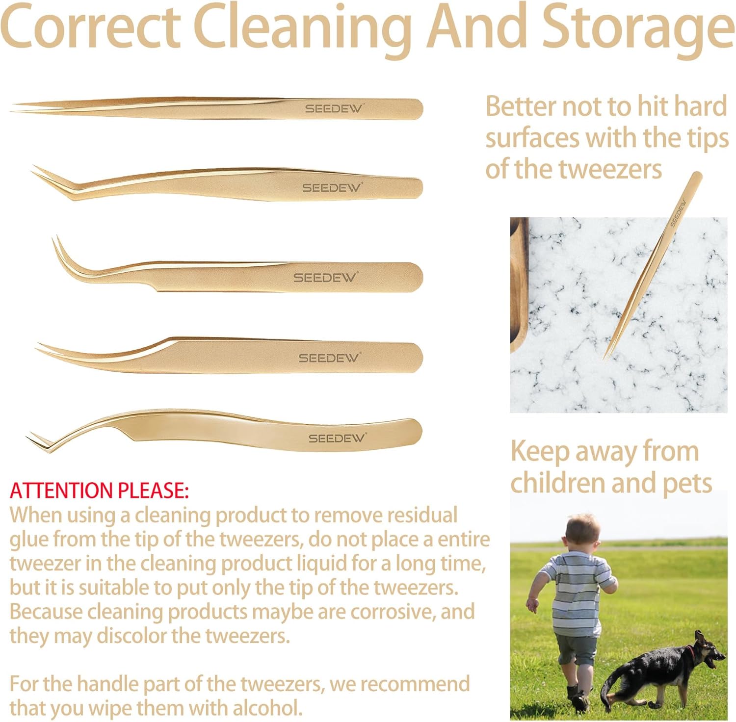 - ⭐【Premium And Classic】SEEDEW stainless steel golden tweezers have texture, smooth surface, classic and elegant style. 1 piece tweezer is equipped with a cover for the tip of the tweezer and a protective case, which is safe for storage, dustproof, dropproof, and imitation of poking.
